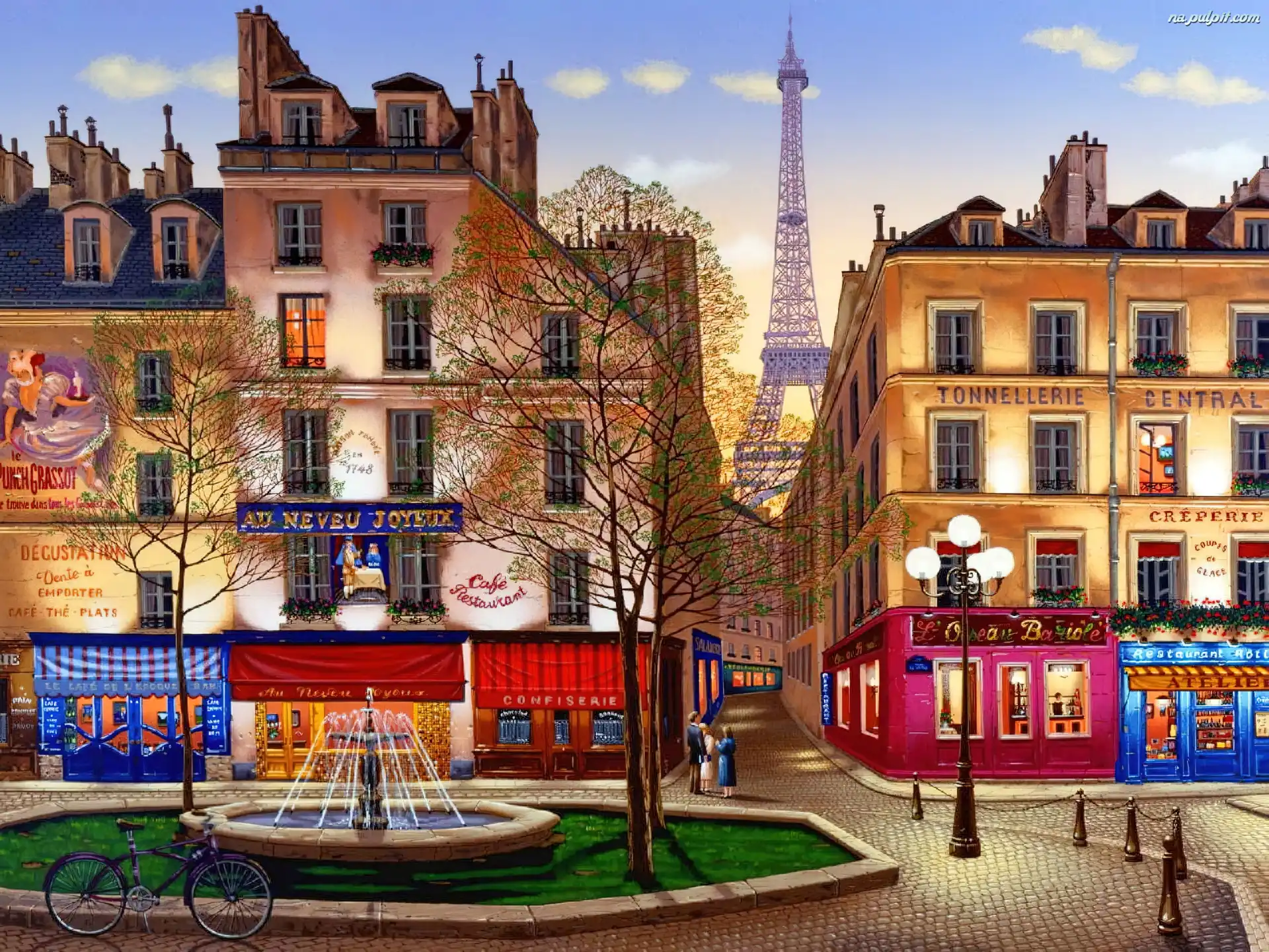 Paryż, Sklepy, Fontanna, Domy, Francja Na Pulpit