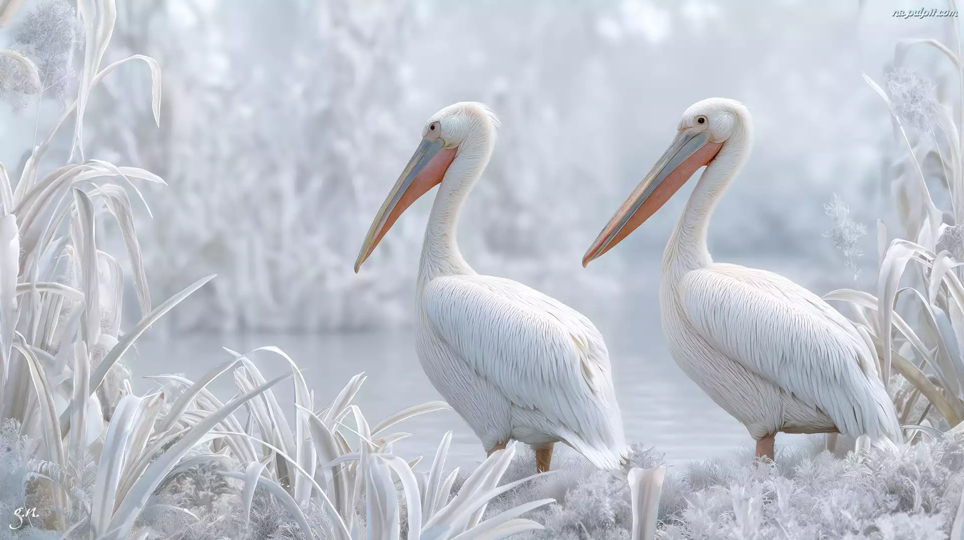 Dwa, Pelikany, Zarośla, Grafika AI Na Pulpit