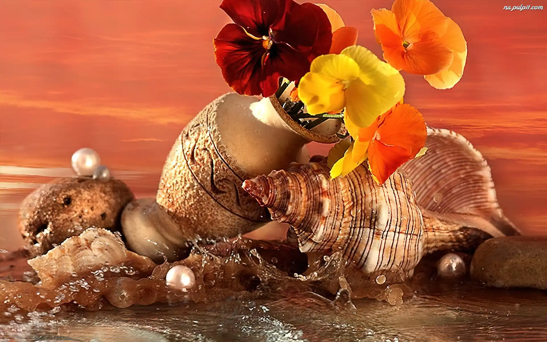 Perły, Dzban, Bukiet, Kwiaty, Muszle