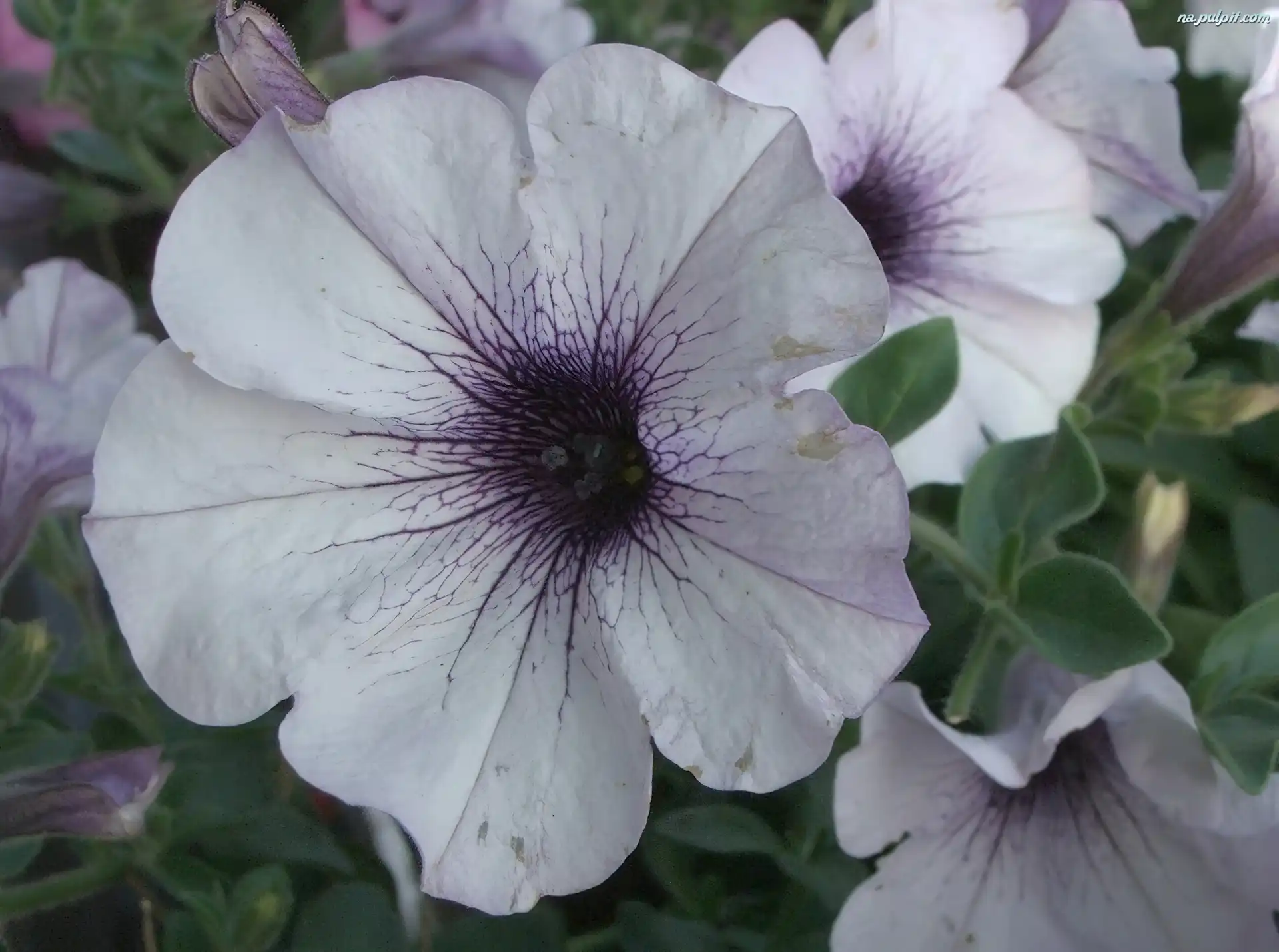 Petunie, Kwiaty, Grafika, Listki Różowa, Petunia ogrodowa Petunie, Różowo, Białe Petunia ogrodowa, Doniczka Fioletowe, Kwiaty, Grafika, Petunie Ogrodowa