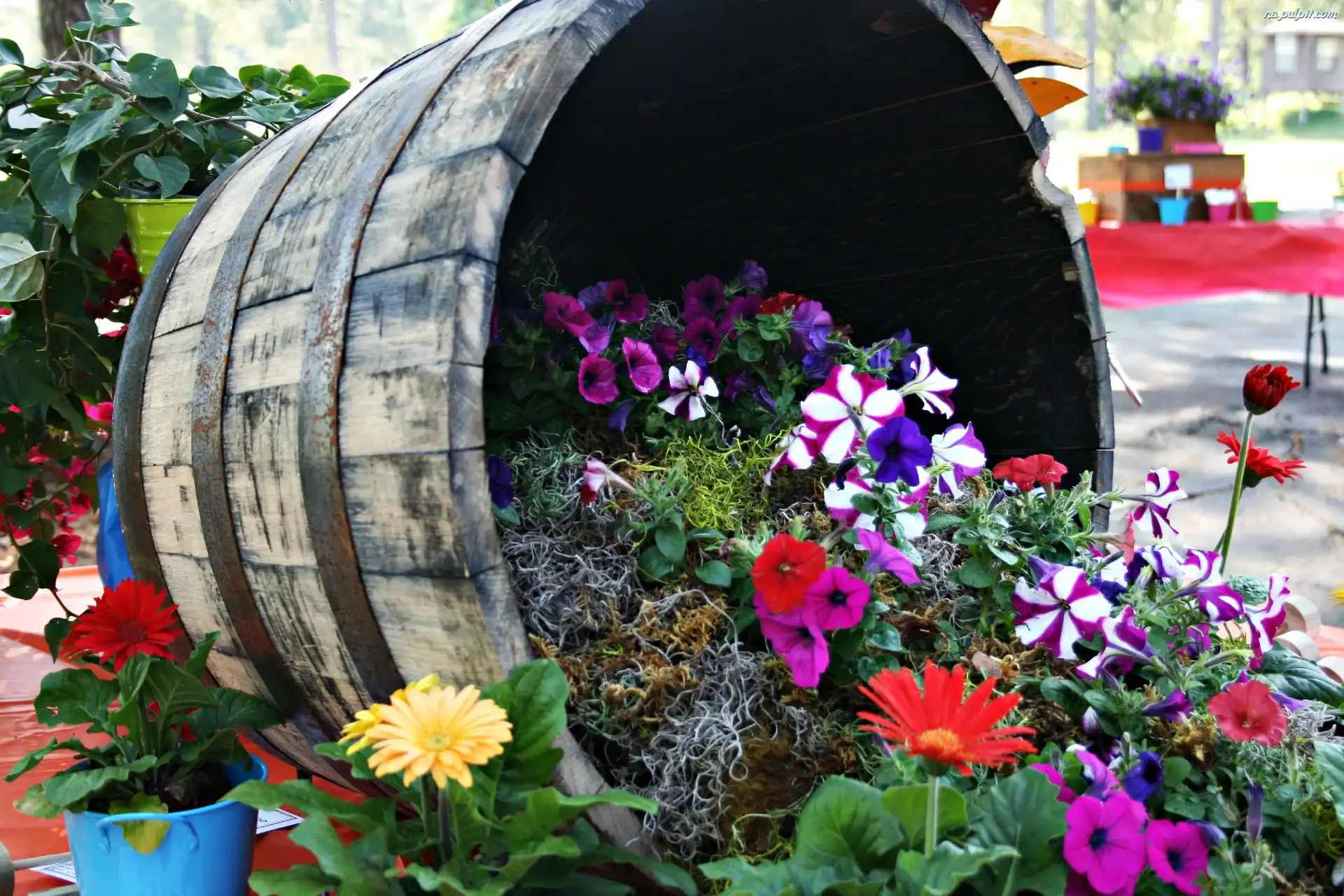 Petunie, Kwiatowa, Kompozycja, Beczka, Gerbery