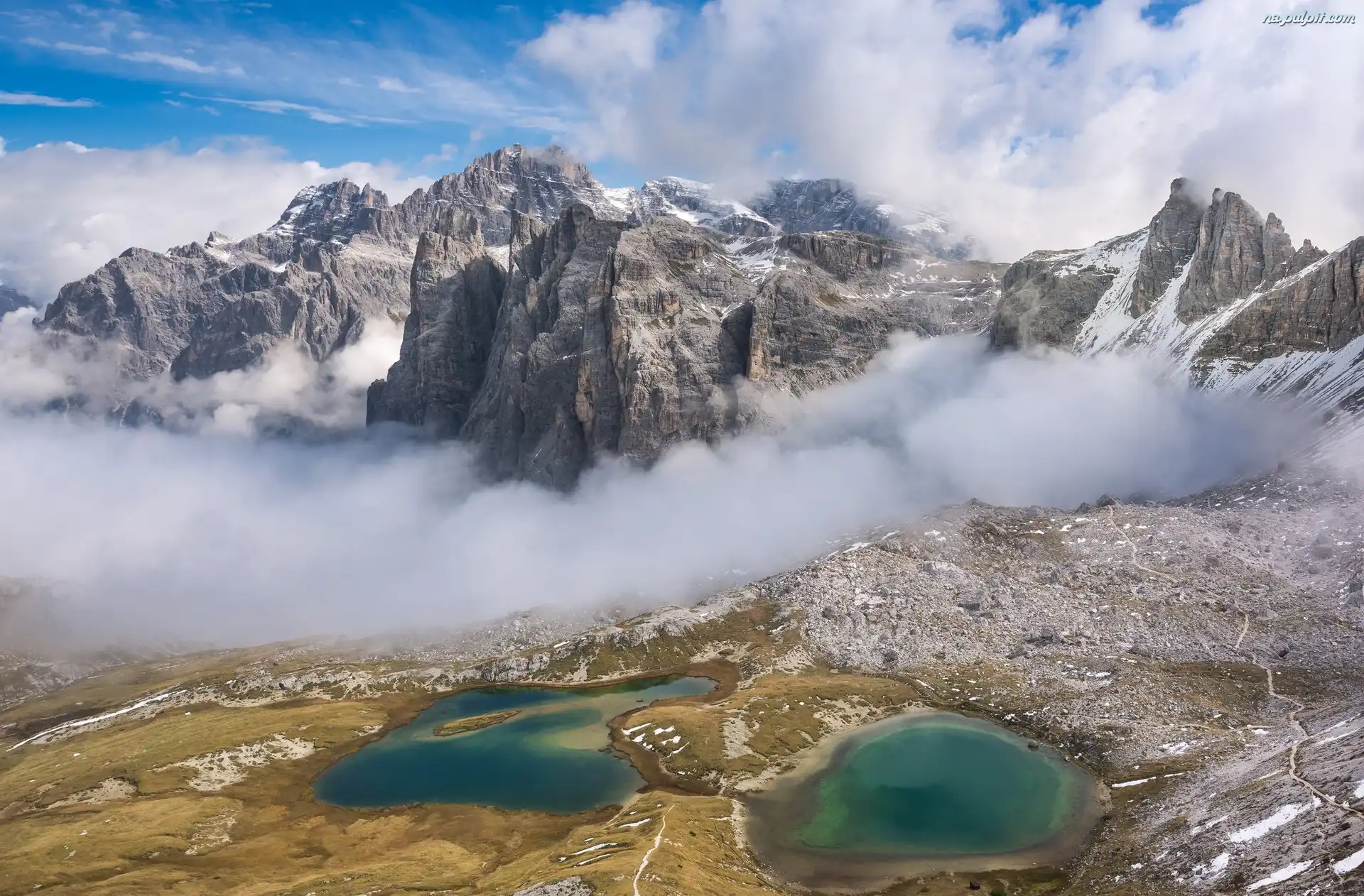 Prowincja Bolzano, Góry, Mgła, Dolomity, Włochy, Jeziora Laghi dei Piani Na Pulpit