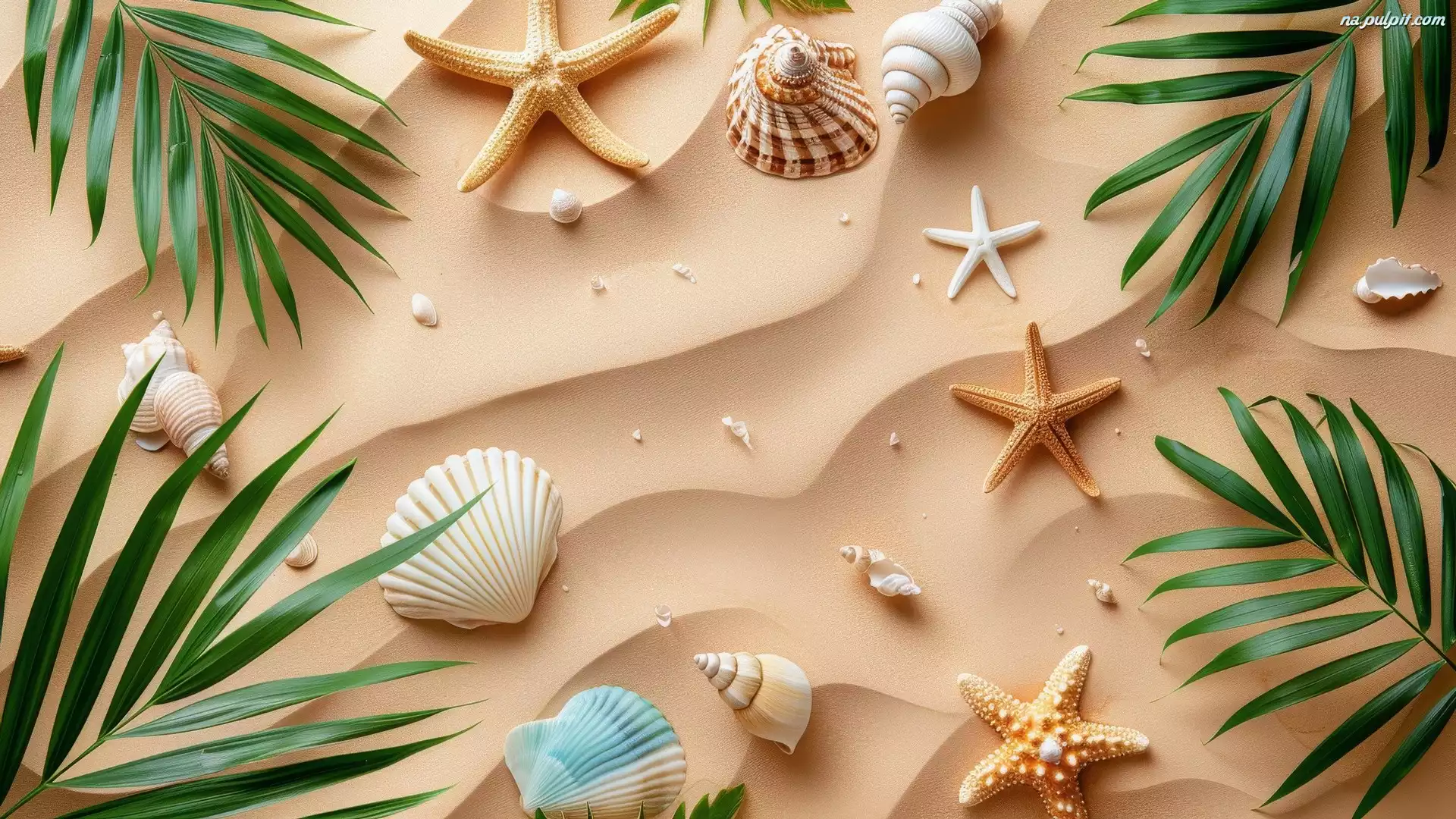 Zielone, Piasek, Muszelki, Liście, Rozgwiazdy Na Pulpit
