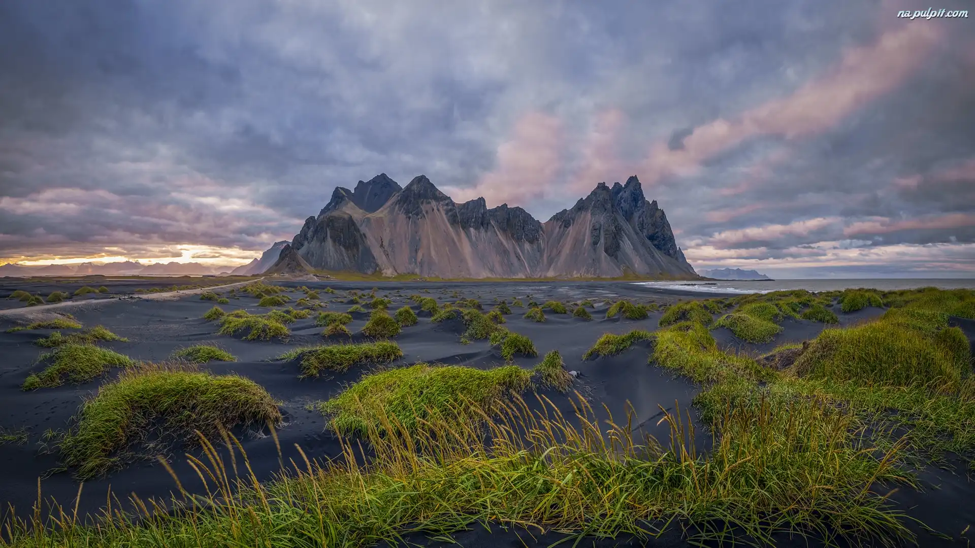 Trawa, Czarny, Plaża, Islandia, Góry, Góra Vestrahorn, Piasek Na Pulpit