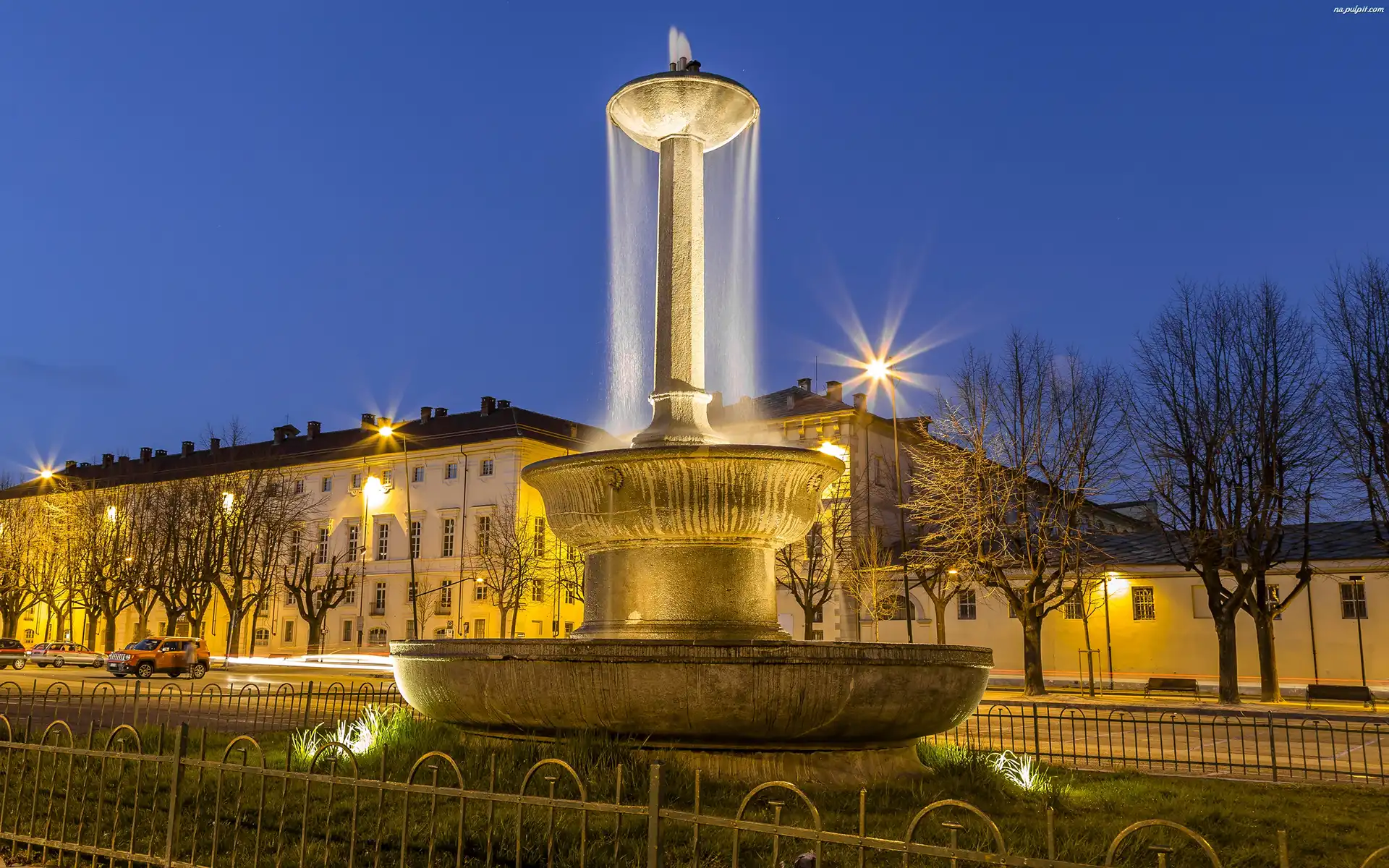 Noc, Region Piemont, Domy, Plac Piazza Vittorio Veneto, Miasteczko Pinerolo, Włochy, Fontanna Na Pulpit |