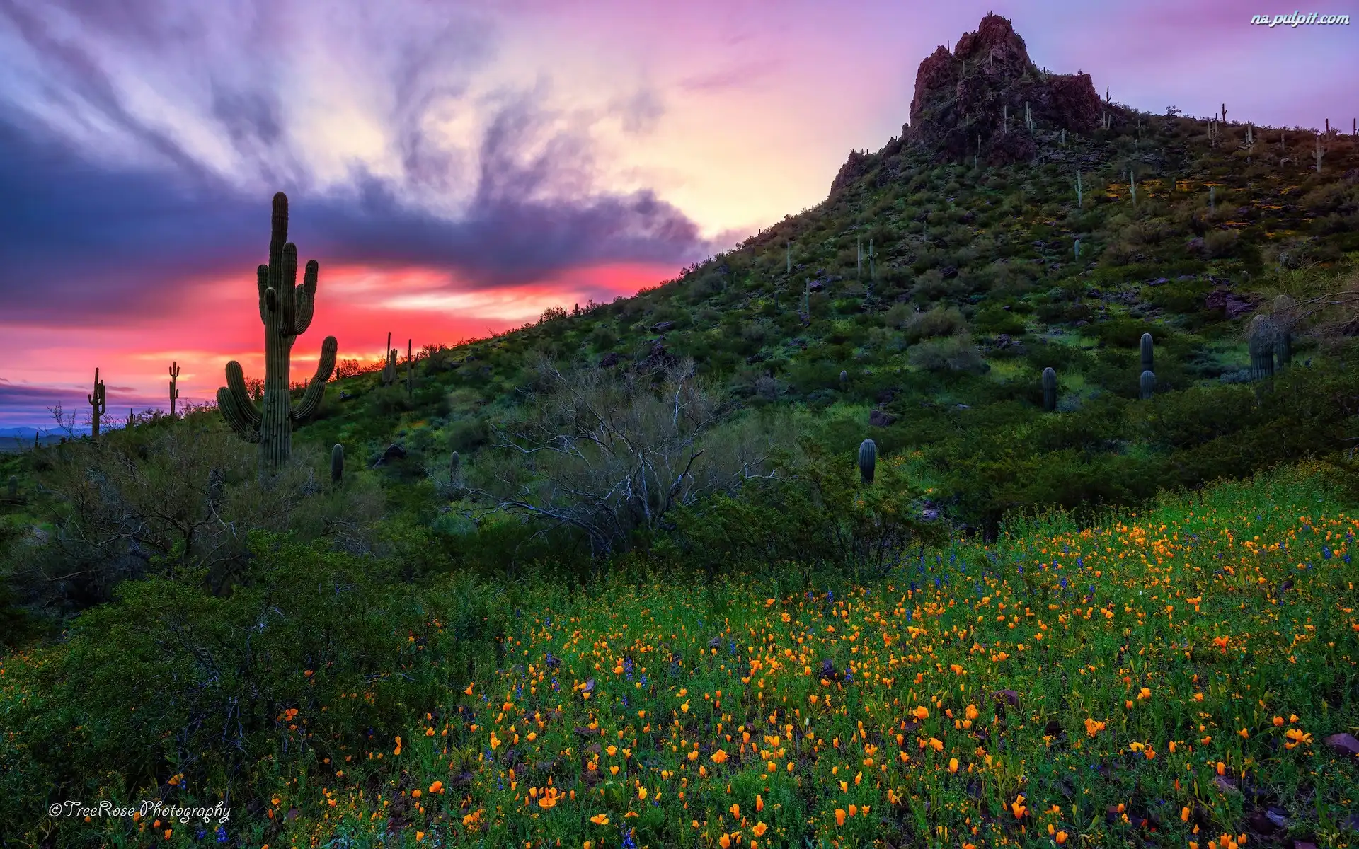 Kwiaty, Łąka, Arizona, Picacho Peak, Góra, Park stanowy, Stany Zjednoczone, Kaktusy, Zachód słońca Na Pulpit |