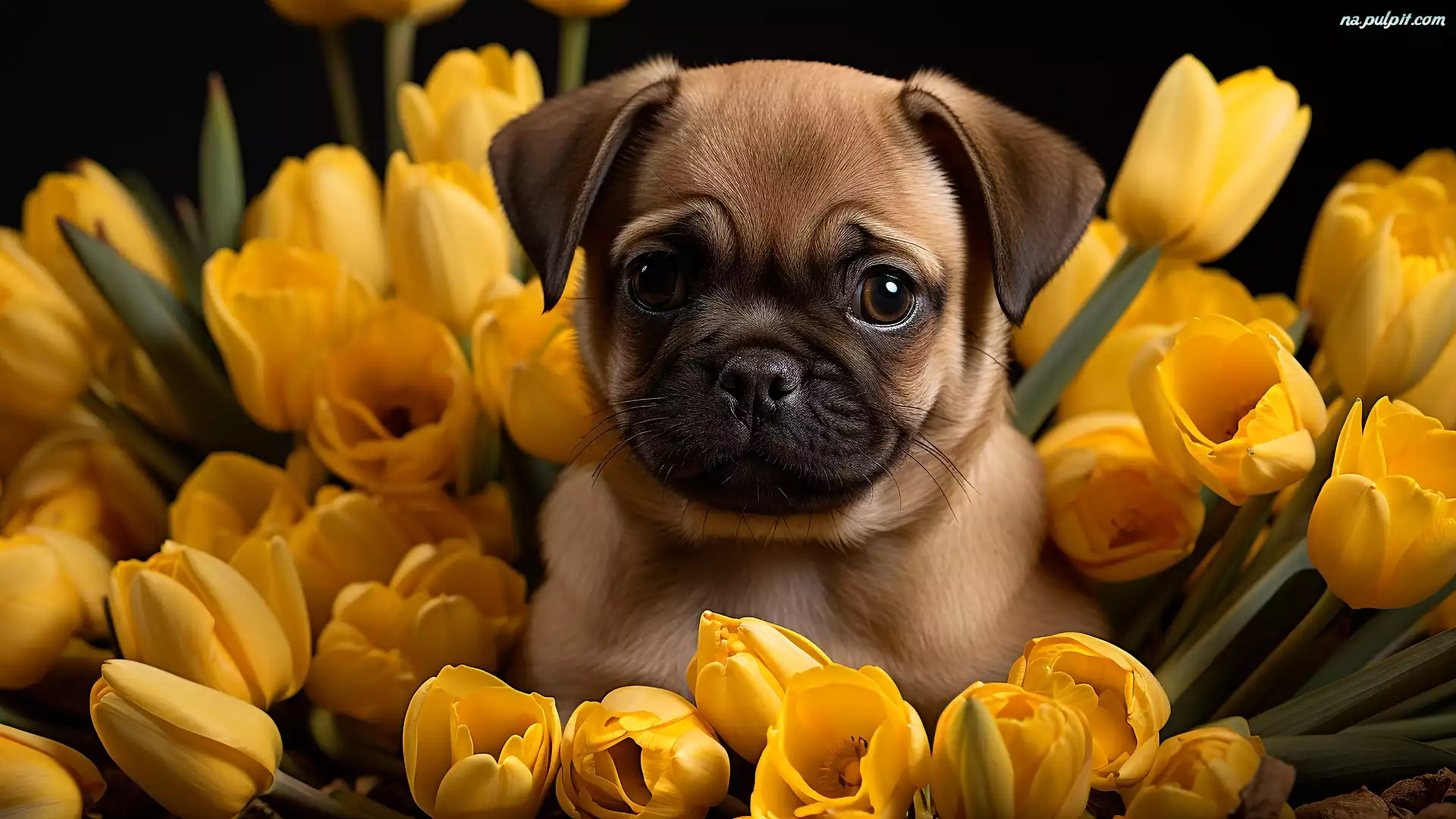 Grafika, Żółte, Tulipany, Pies, Mops, Szczeniak, Kwiaty Na Pulpit