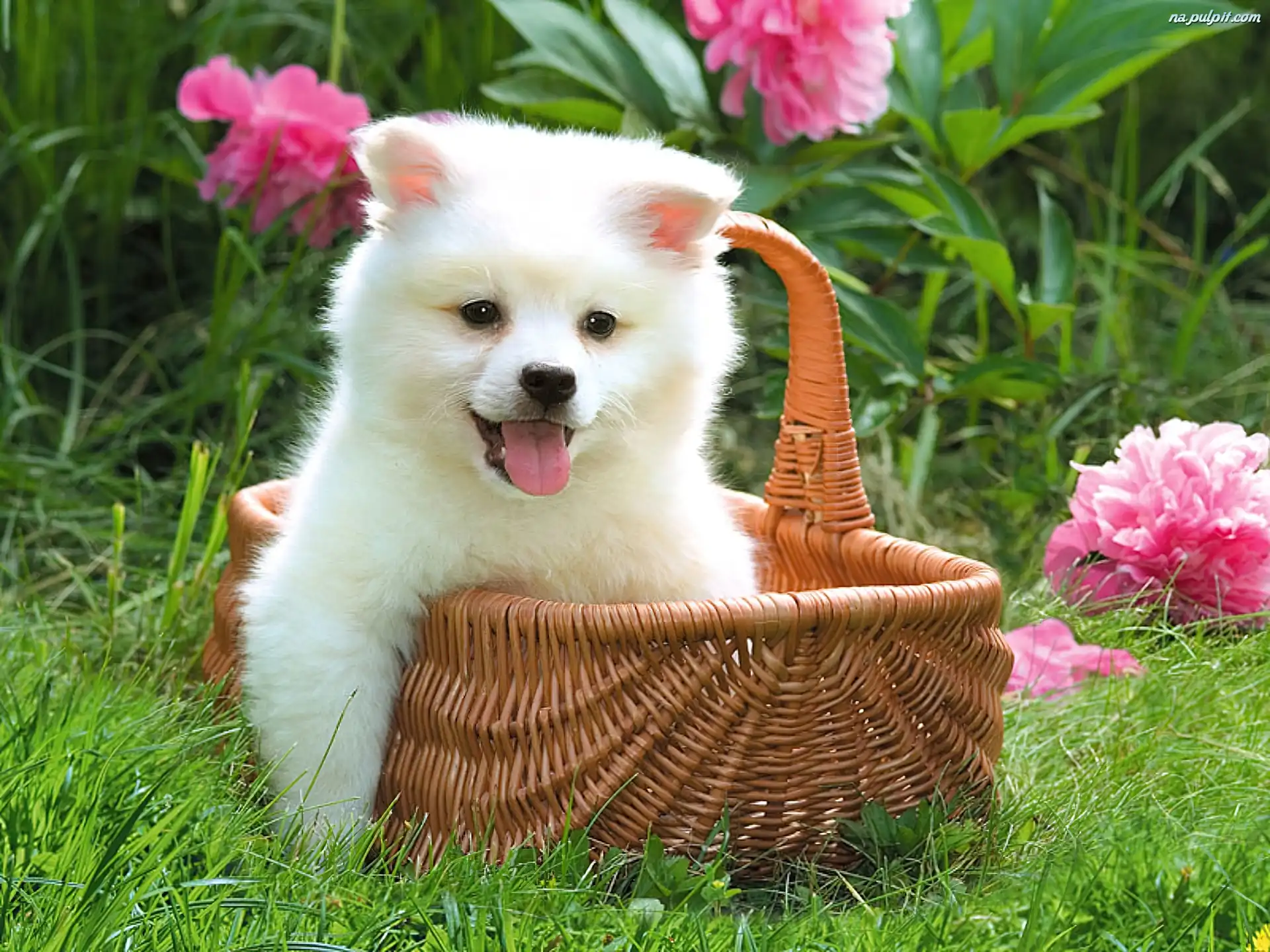 Piesek, Kwiaty, Trawa, Koszyk Na Pulpit