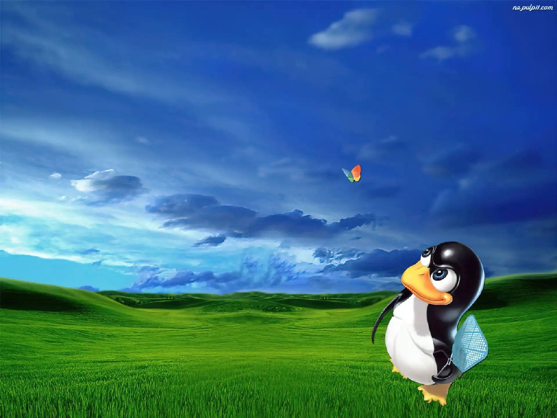 pingwin, wzgórza, trawa, łapka, Linux, motyl Na Pulpit