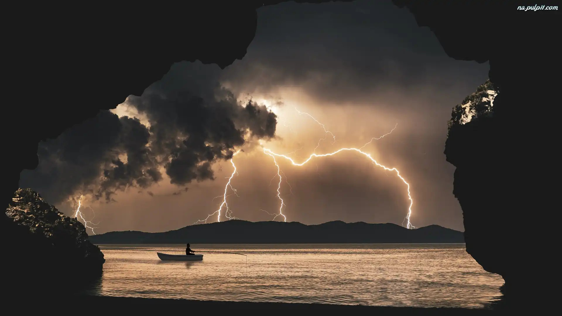 Pioruny, Łódka, Rzeka, Skały, Burza