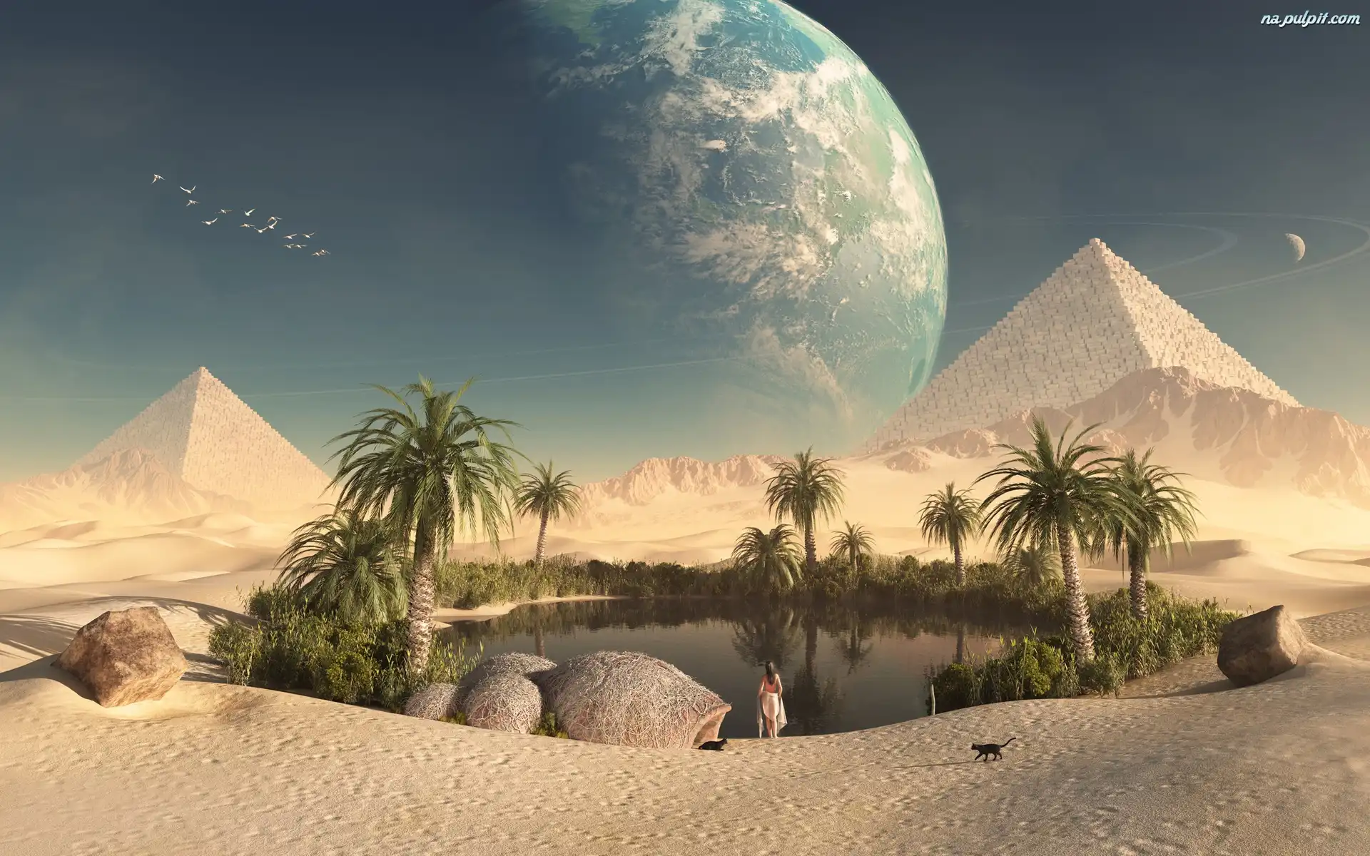Piramidy, Kobieta, Planeta, Woda, Pustynia, Palmy Na Pulpit