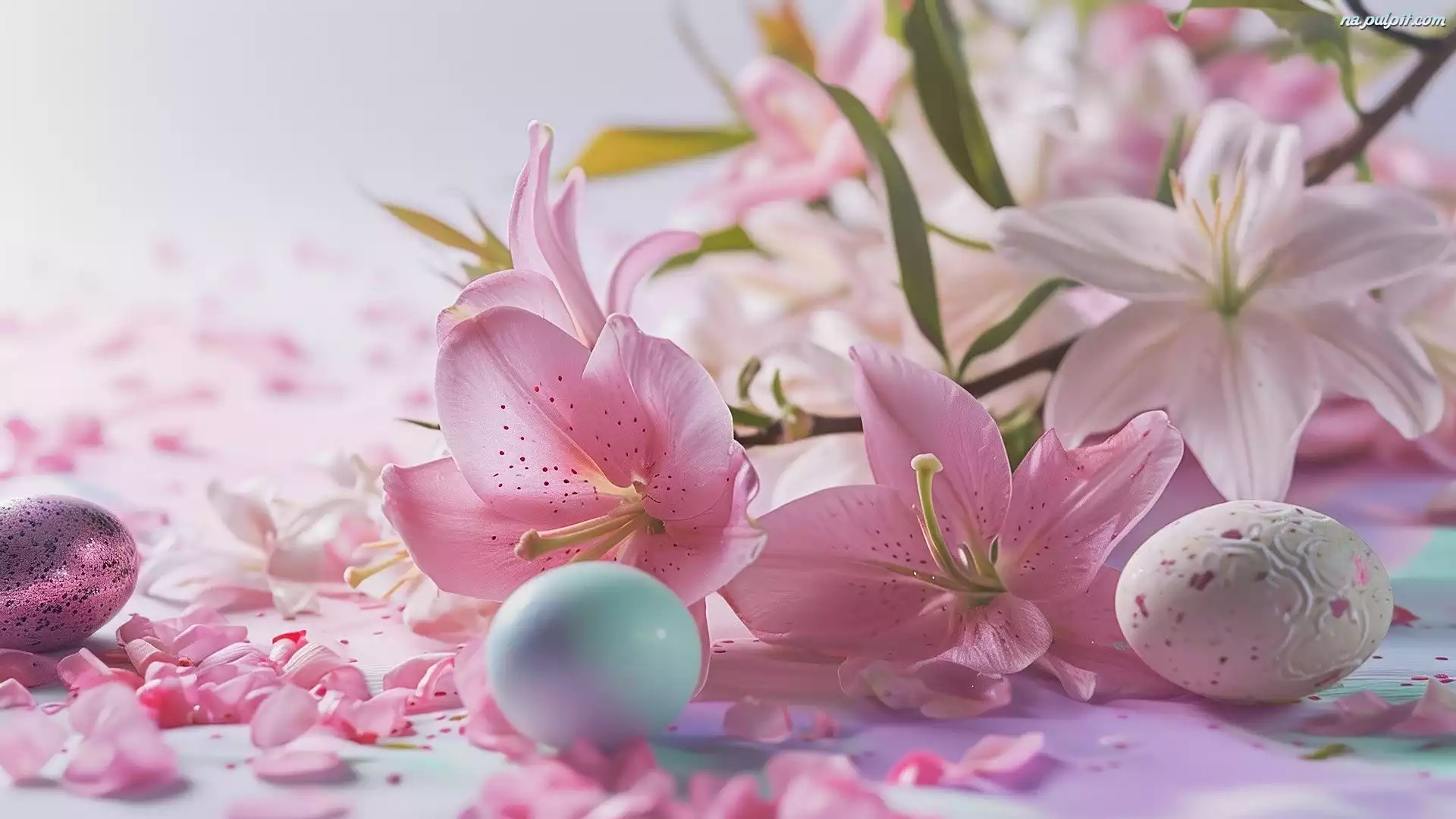 Różowe, Kolorowe, Białe, Wielkanoc, Płatki, Lilie, Trzy, Pisanki Na Pulpit