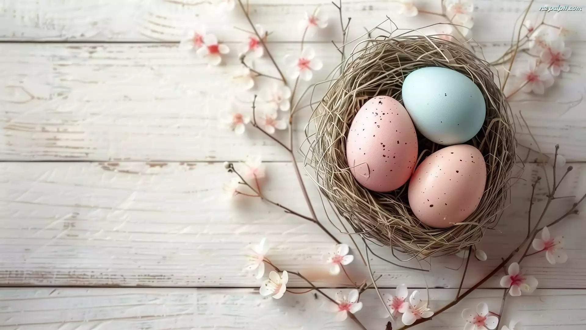 Gniazdo, Niebieskie, Gałązki, Wielkanoc, Kwiaty, Białe, Różowe, Pisanki Na Pulpit