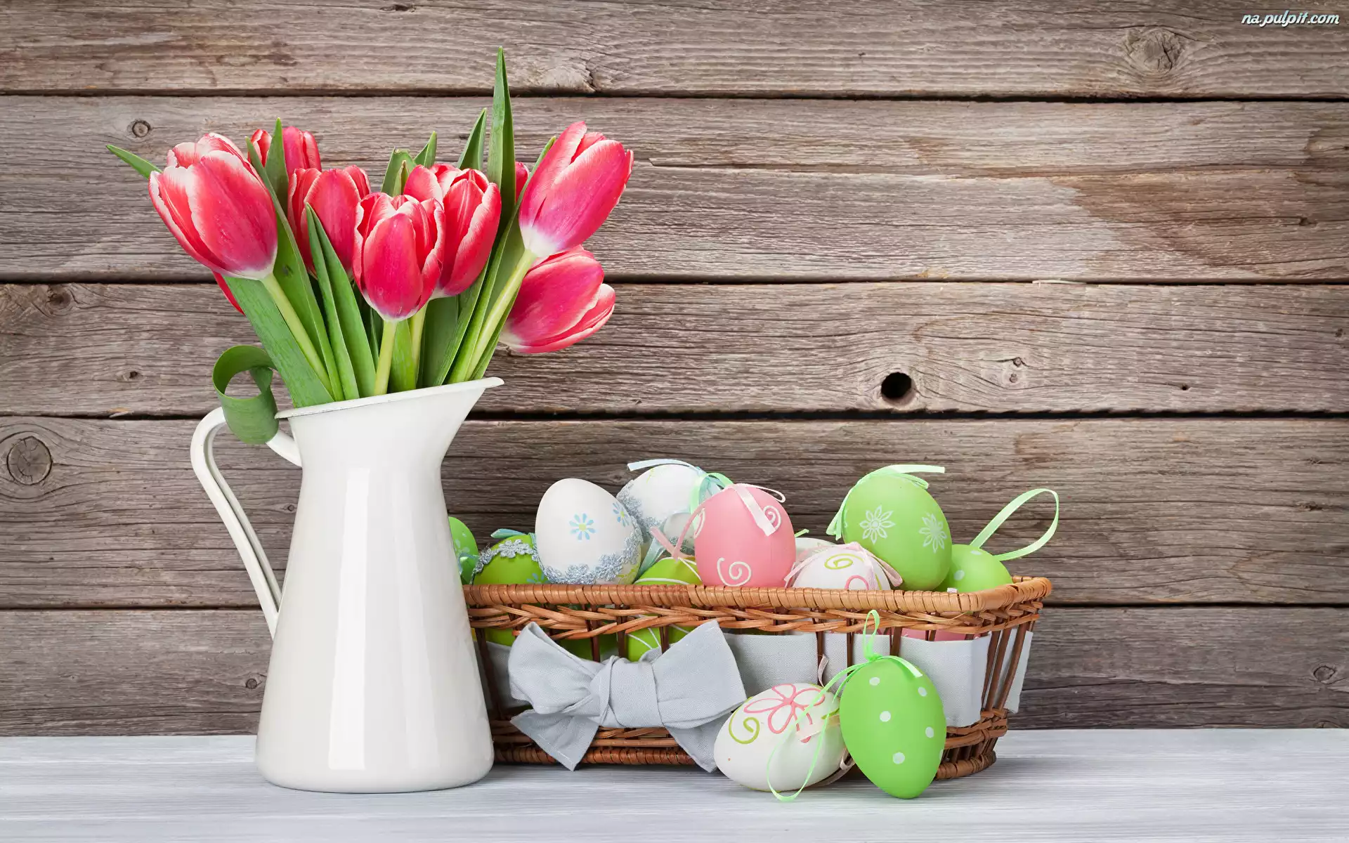 Pisanki, Tulipany, Deski, Bukiet, Dzbanek, Kokardka, Kwiaty, Biały, Koszyk, Kolorowe Na Pulpit