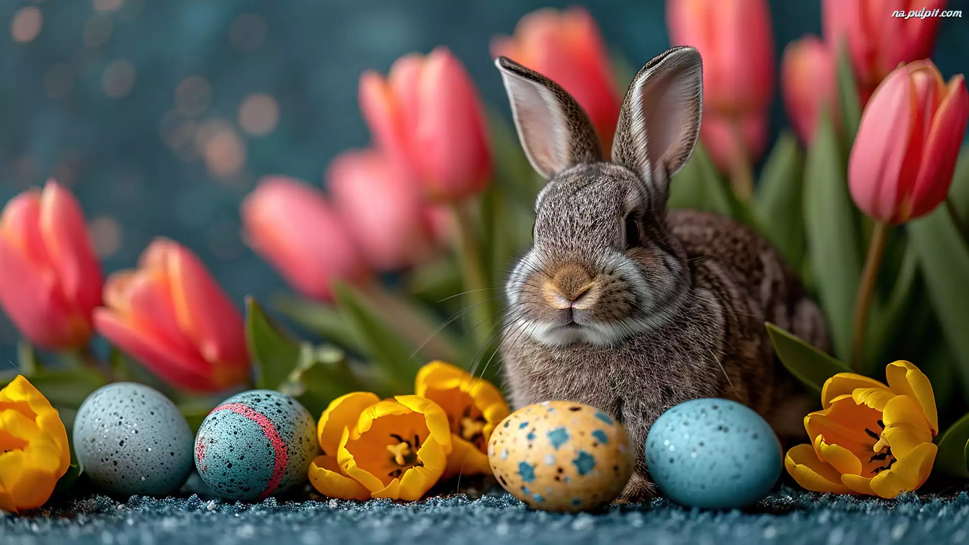 Kolorowe, Wielkanoc, Nakrapiane, Pisanki, Królik, Tulipany