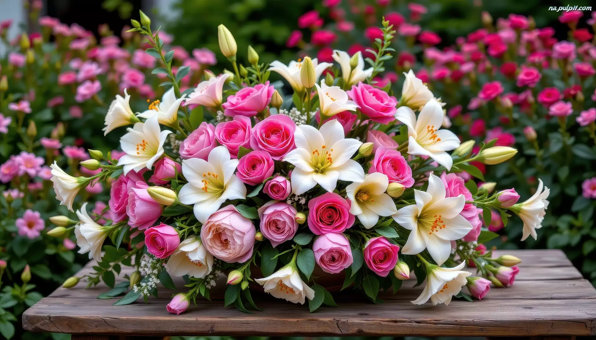 Bukiet, Lilie, Stolik, Kwiaty, AI, Ogród, Róże, Piwonie Na Pulpit