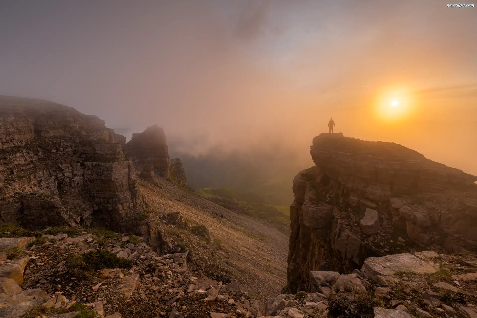 Płaskowyż Bermamyt, Kaukaz, Skały, Mgła, Republika Karaczajo-Czerkiesja, Rosja, Człowiek, Góry, Promienie słońca Na Pulpit |