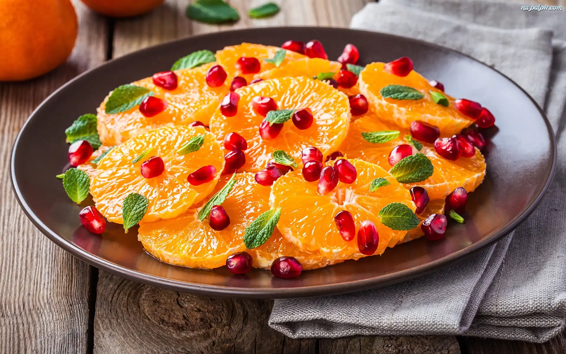 Talerz, Plasterki, Poczęstunek, Granatu, Pestki, Pomarańcze, Listki