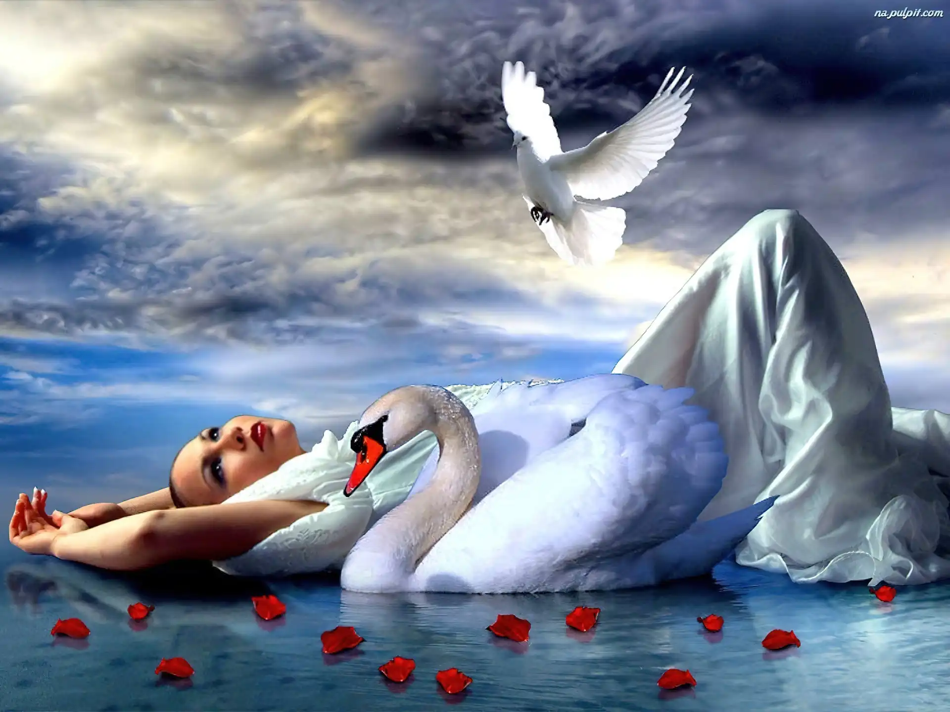 Płatki, Woda, Łabędź, Kobieta, Ptak Na Pulpit