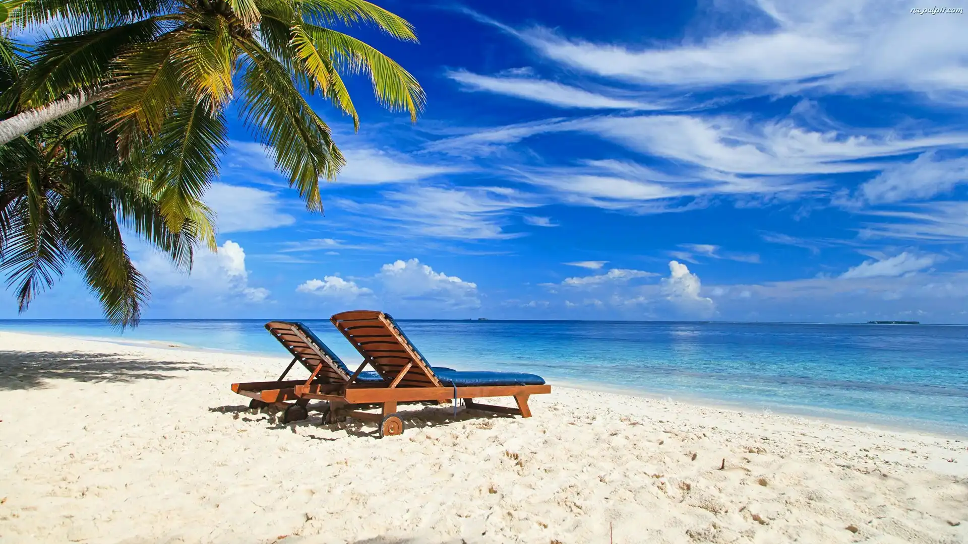 Plaża, Leżaki, Chmury, Morze, Bahamy, Palmy Na Pulpit