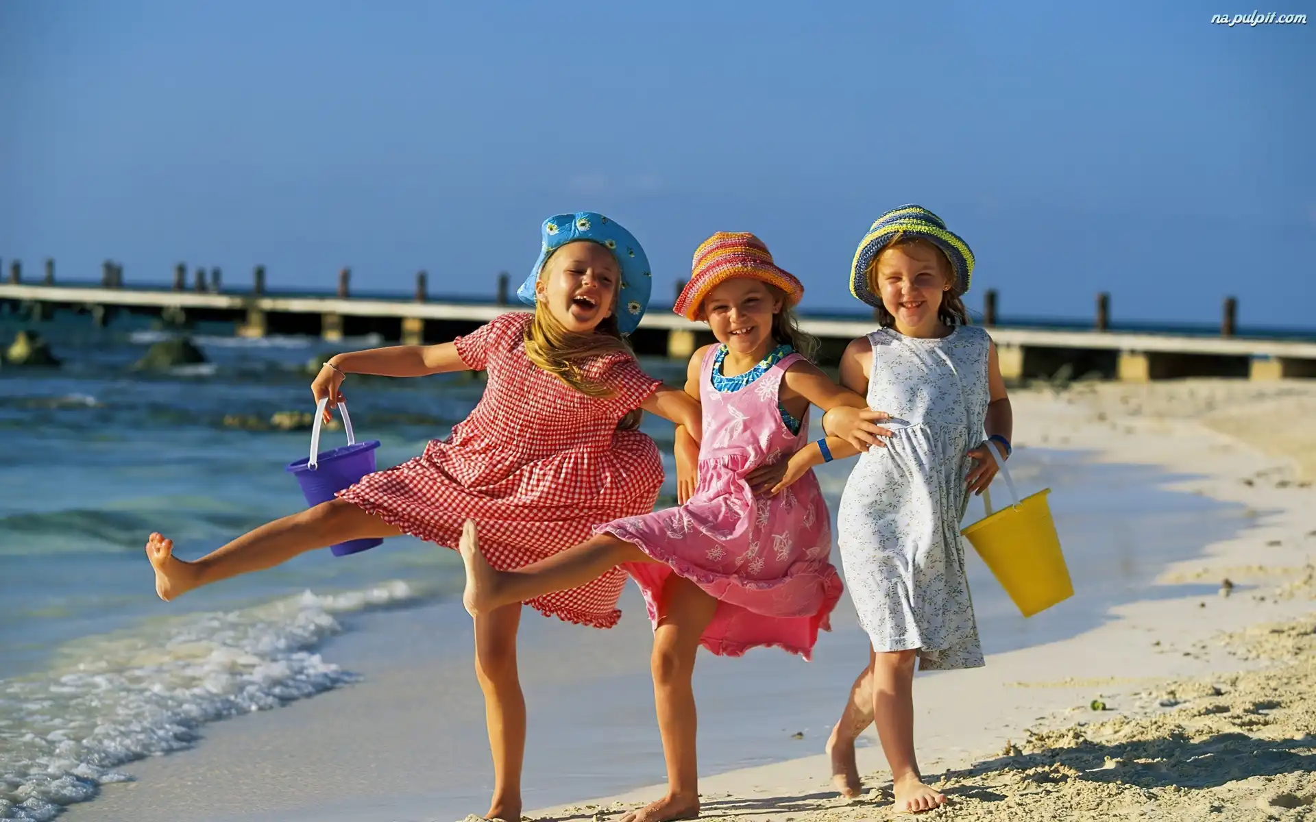 Plaża, Wiaderka, Zabawa, Woda, Dzieci, Most