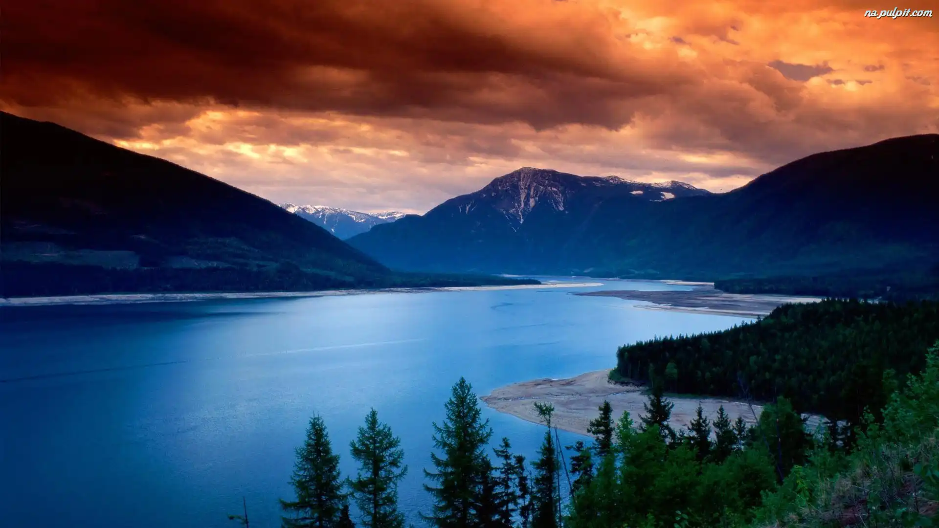 Plaża, Zachód, Słońca, Góry, Jezioro, Drzewa Na Pulpit