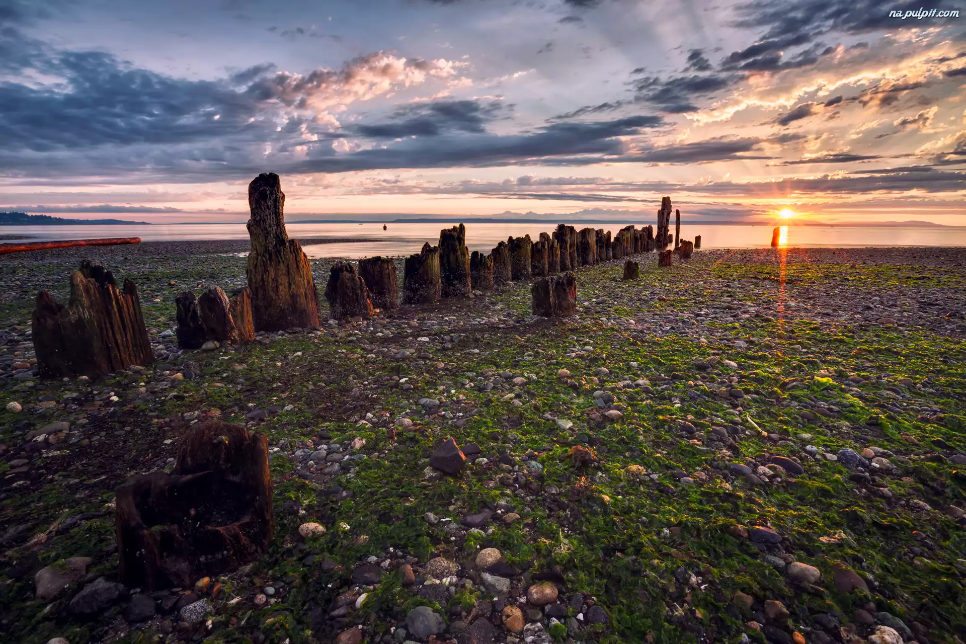 Plaża, Słońca, Pale, Jezioro, Kamienista, Wschód