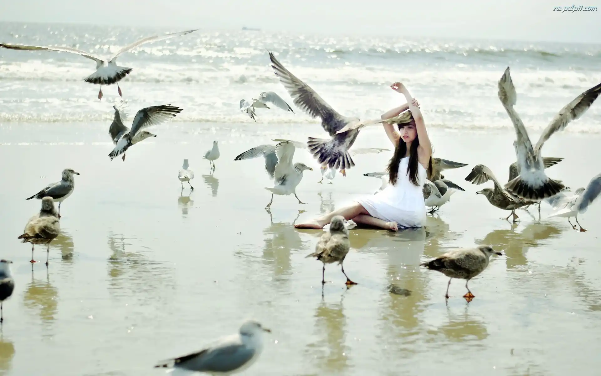 Plaża, Sukienka, Biała, Kobieta, Mewy Na Pulpit