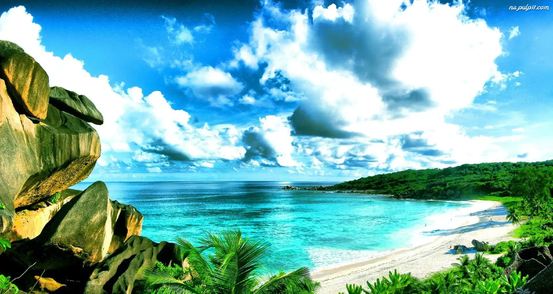 Plaża, Chmury, Seszele, Roślinność, Morze, Kamienie Na Pulpit