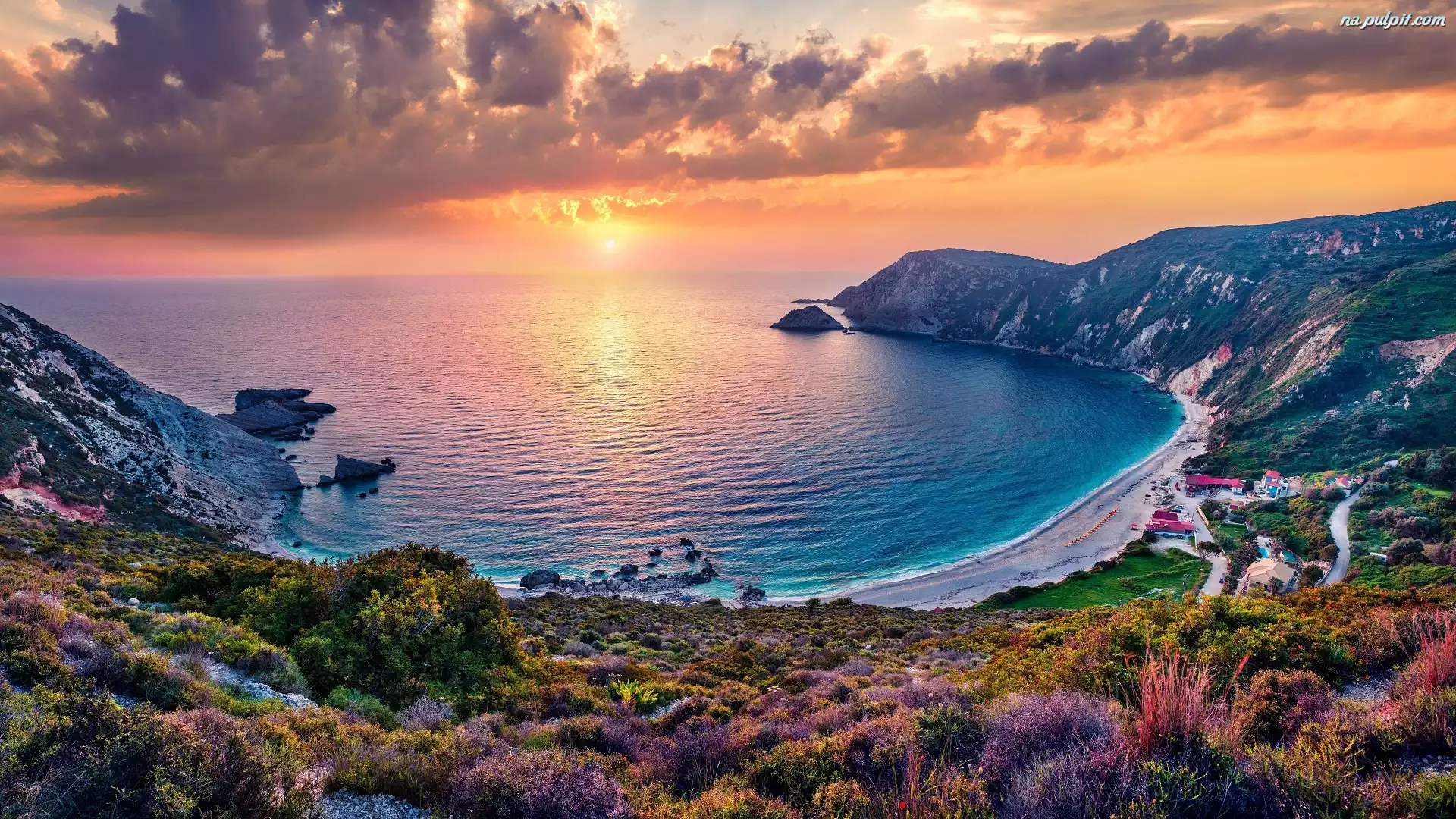 Zachód słońca, Morze, Plaża, Góry, Zatoka, Chmury Na Pulpit