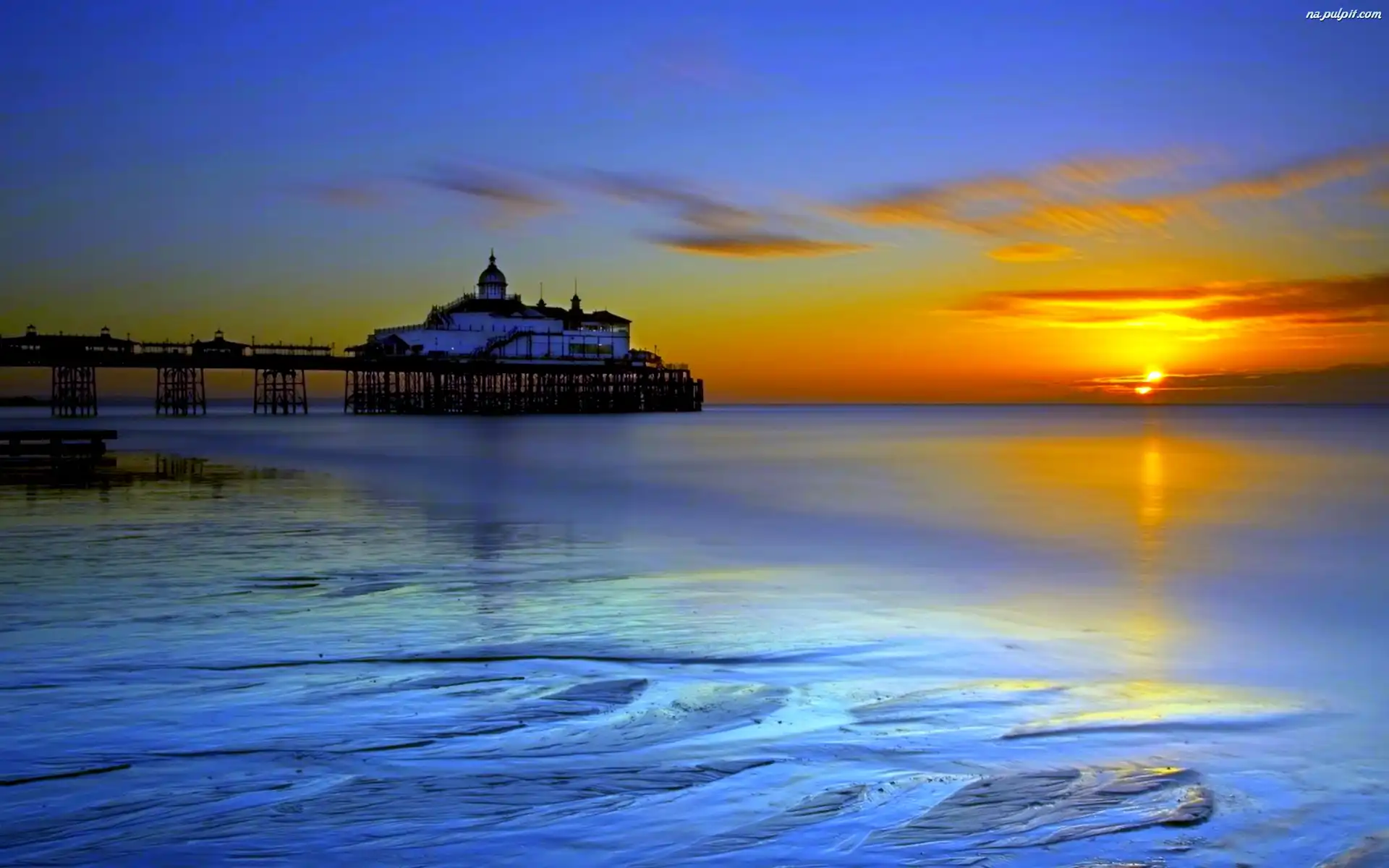 Plaża, Zachód, Słońca, Molo, Morze, Dom Na Pulpit
