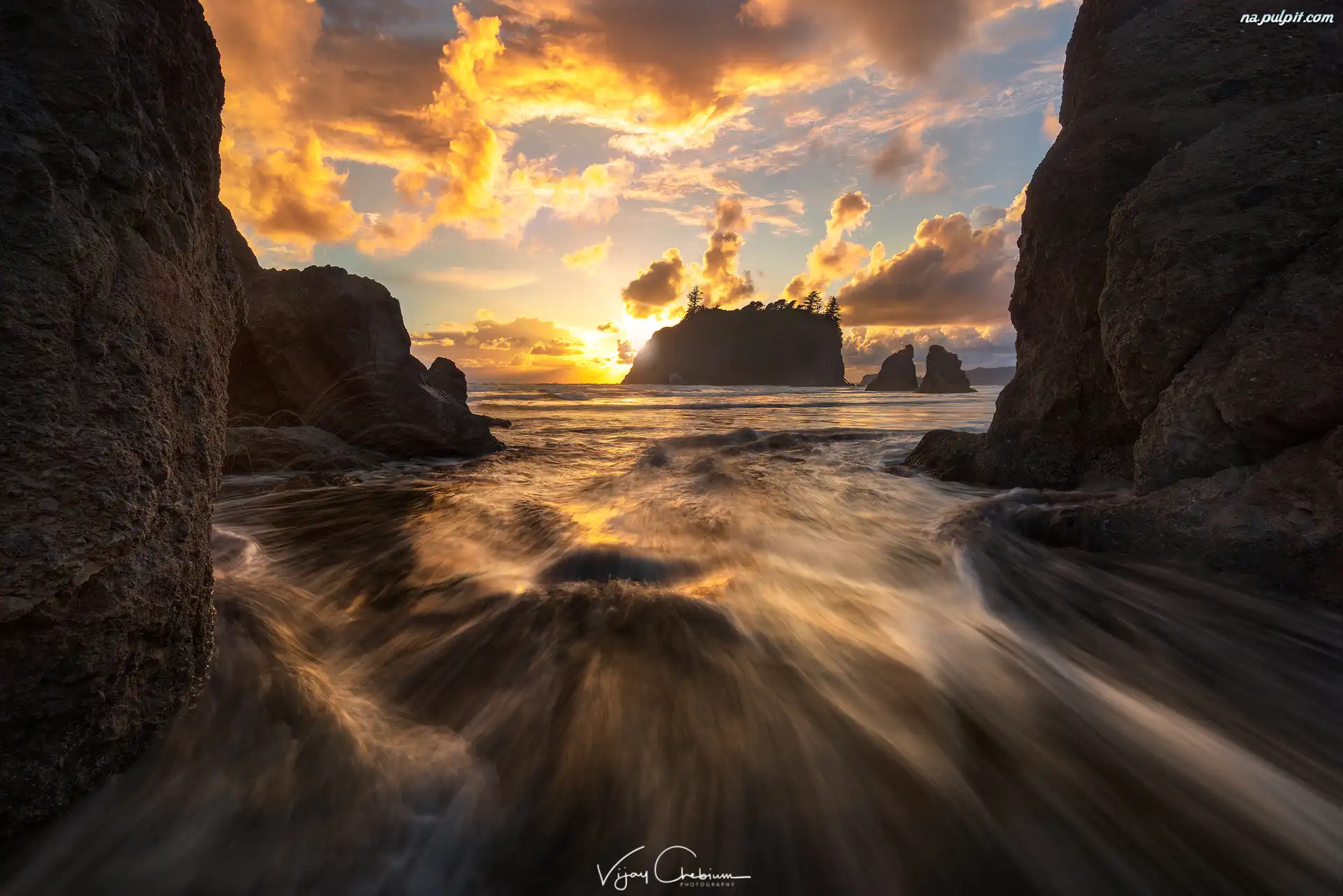 Plaża Ruby Beach, Skały, Chmury, Stan Waszyngton, Stany Zjednoczone, Wschód słońca, Morze, Park Narodowy Olympic Na Pulpit |