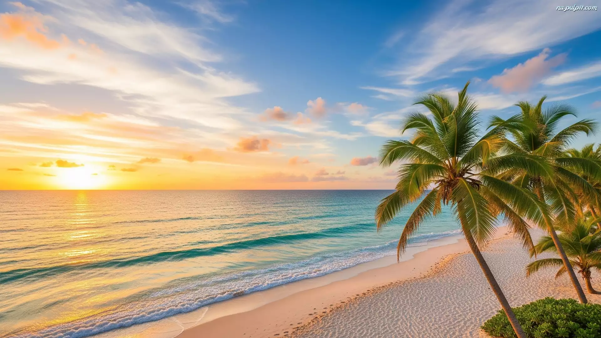 Zachód słońca, Morze, Plaża, Palmy, Niebo Na Pulpit