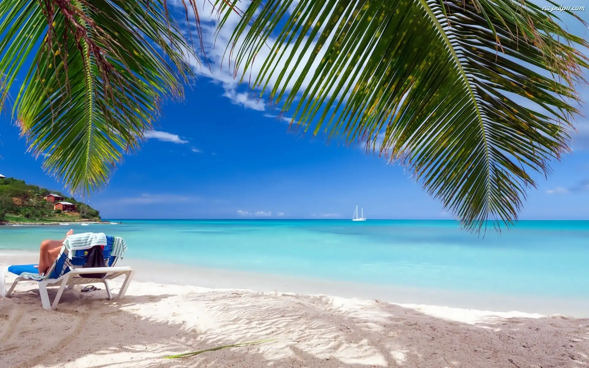 Tropiki, Plaża, Leżak, Lato, Wakacje, Palmy, Morze, Łódka