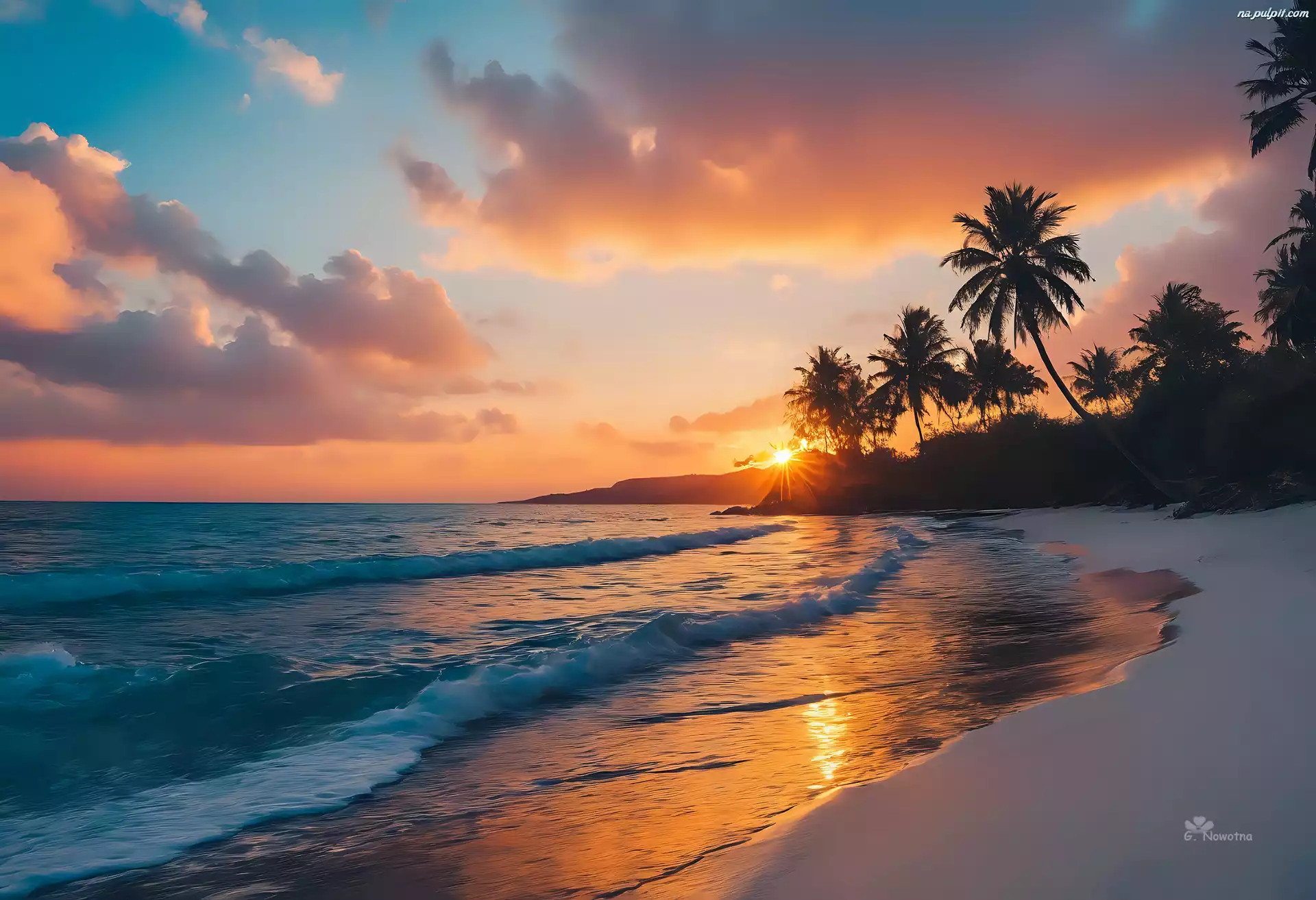 Zachód słońca, Morze, Plaża, Chmury, Palmy Na Pulpit