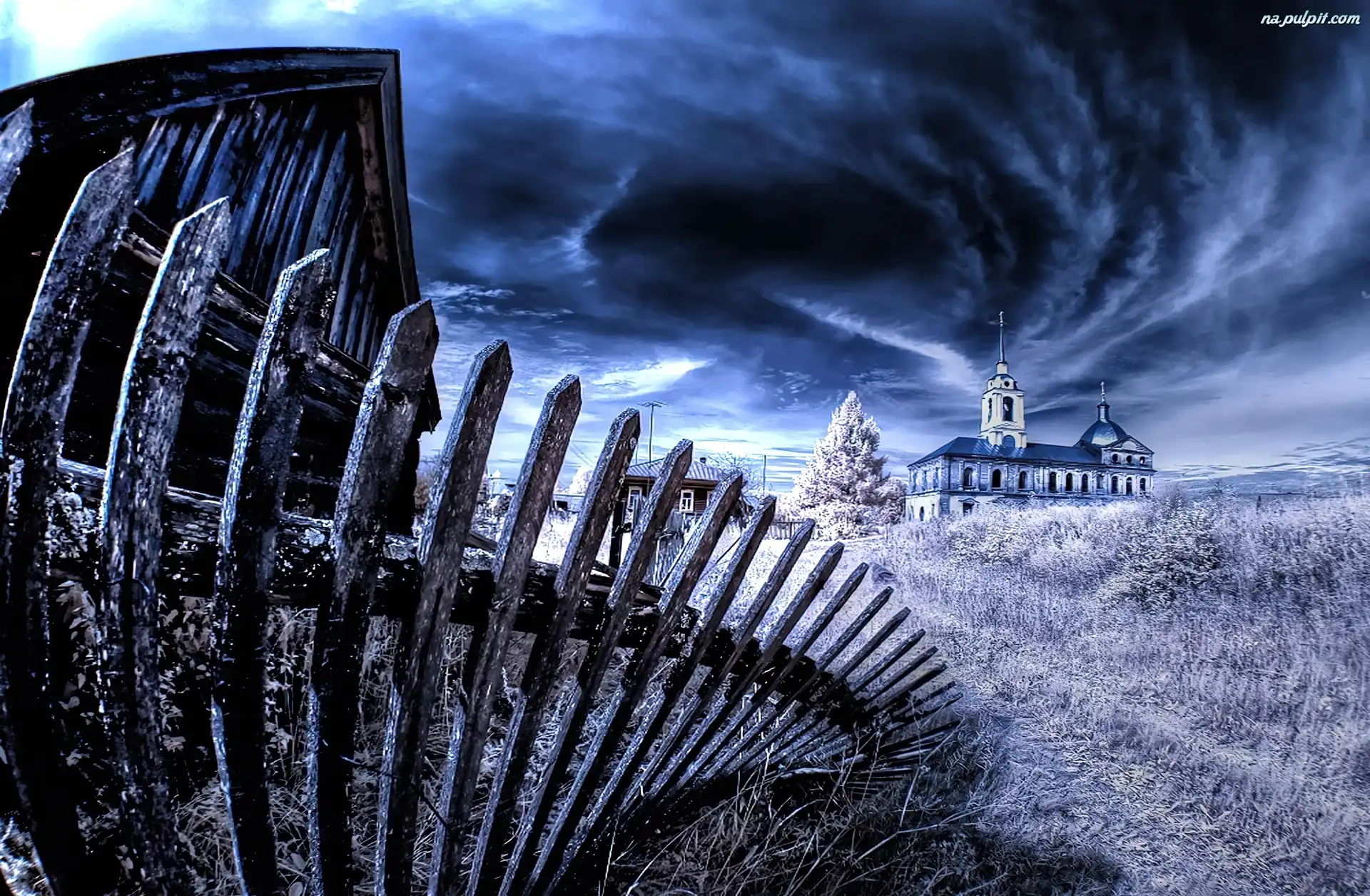 Płot, Chmury, Budynek, Pochylony