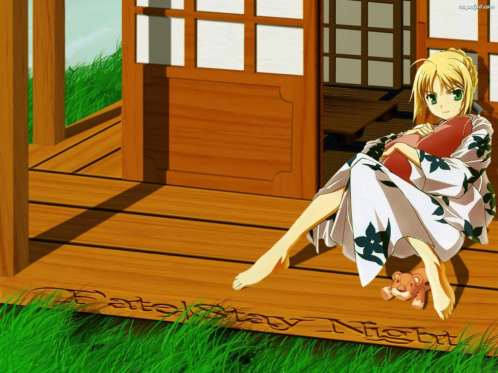 kobieta, pluszak, trawa, dom, Fate Stay Night Na Pulpit