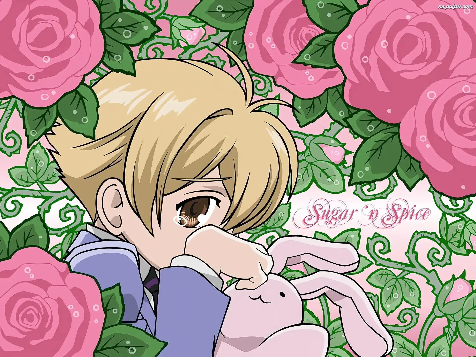 kwiaty, pluszak, Ouran High School Host Club, twarz Na Pulpit