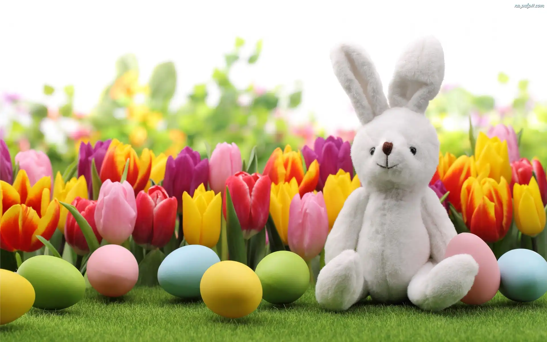Pluszowy Króliczek, Pisanki, Jajka, Wielkanoc, Tulipany Na Pulpit
