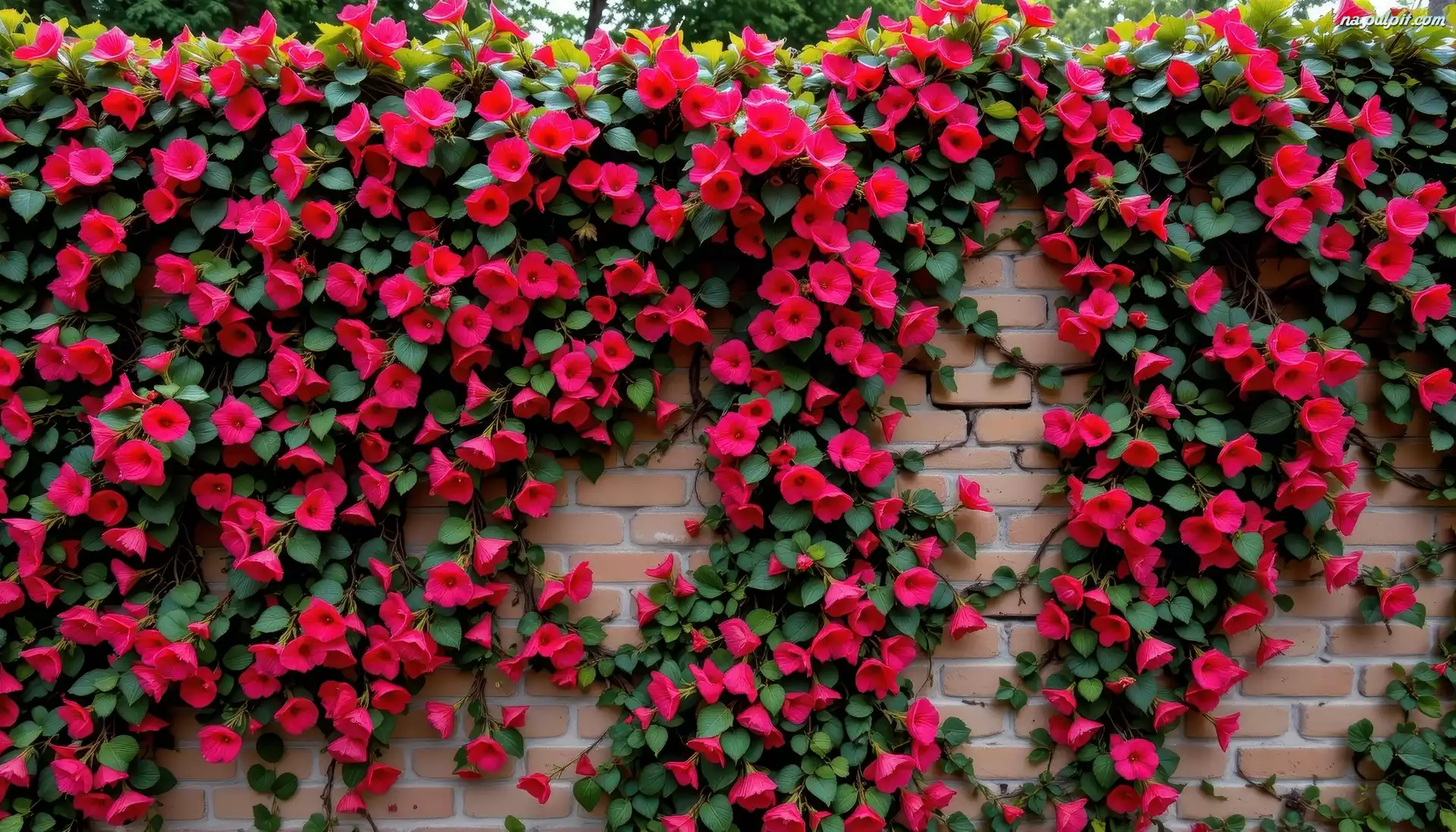 Czerwone, Mur, Kwiaty, Pnące, Cegły, Grafika AI Na Pulpit