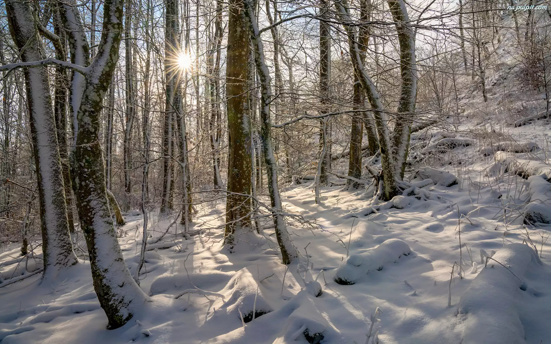 Śnieg, Zima, Drzewa, Pnie, Las, Promienie słońca Na Pulpit
