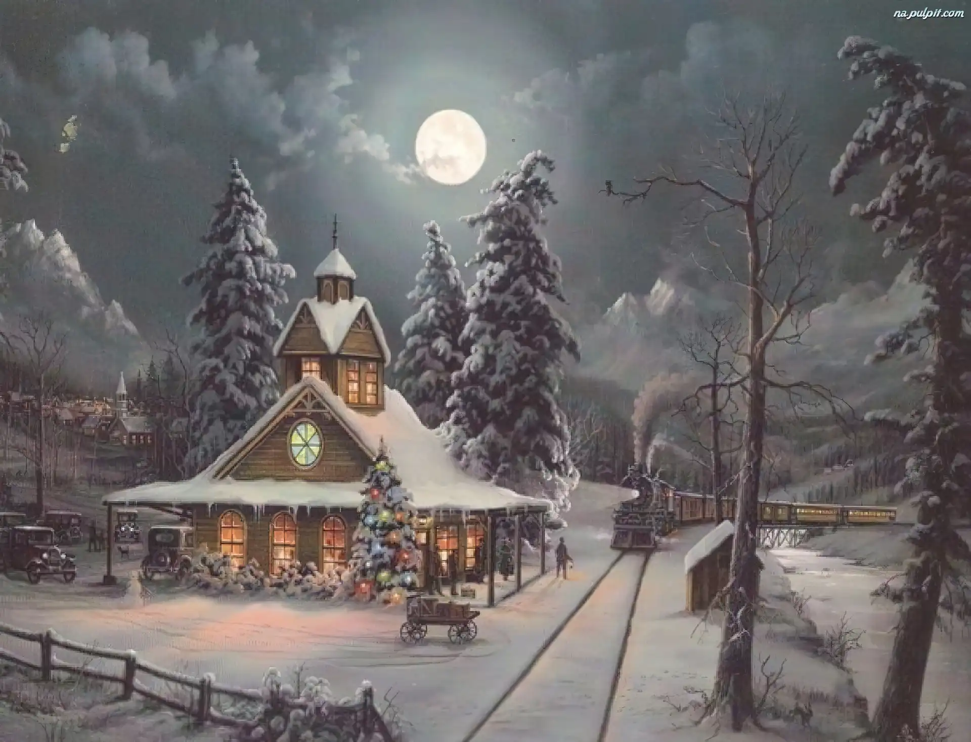 Pociąg, Narodzenie, Malarstwo, Zima, Dworzec, Boże Na Pulpit