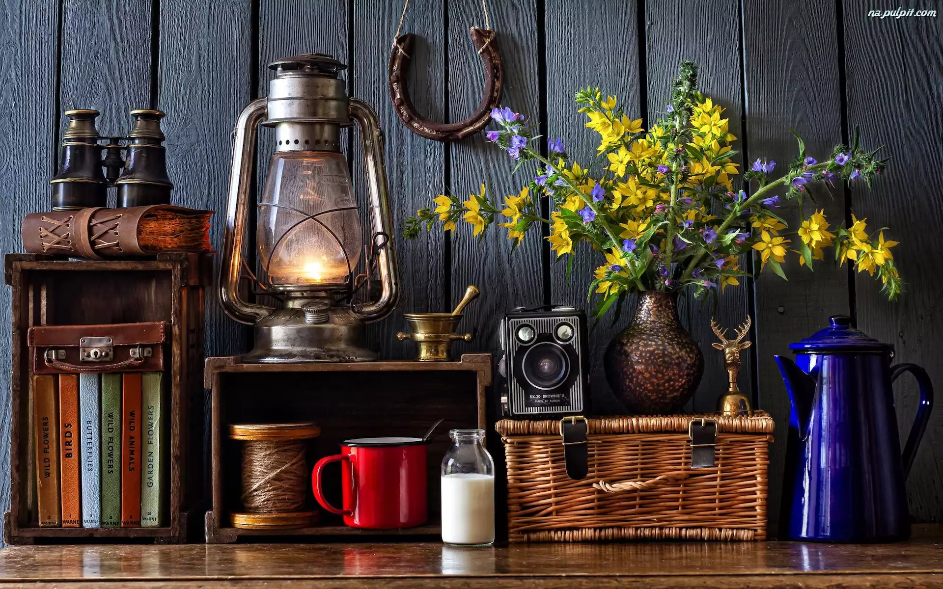 Podkowa, Lampa, Deski, Kompozycja, Dzbanek, Kubek, Bukiet kwiatów, Książki