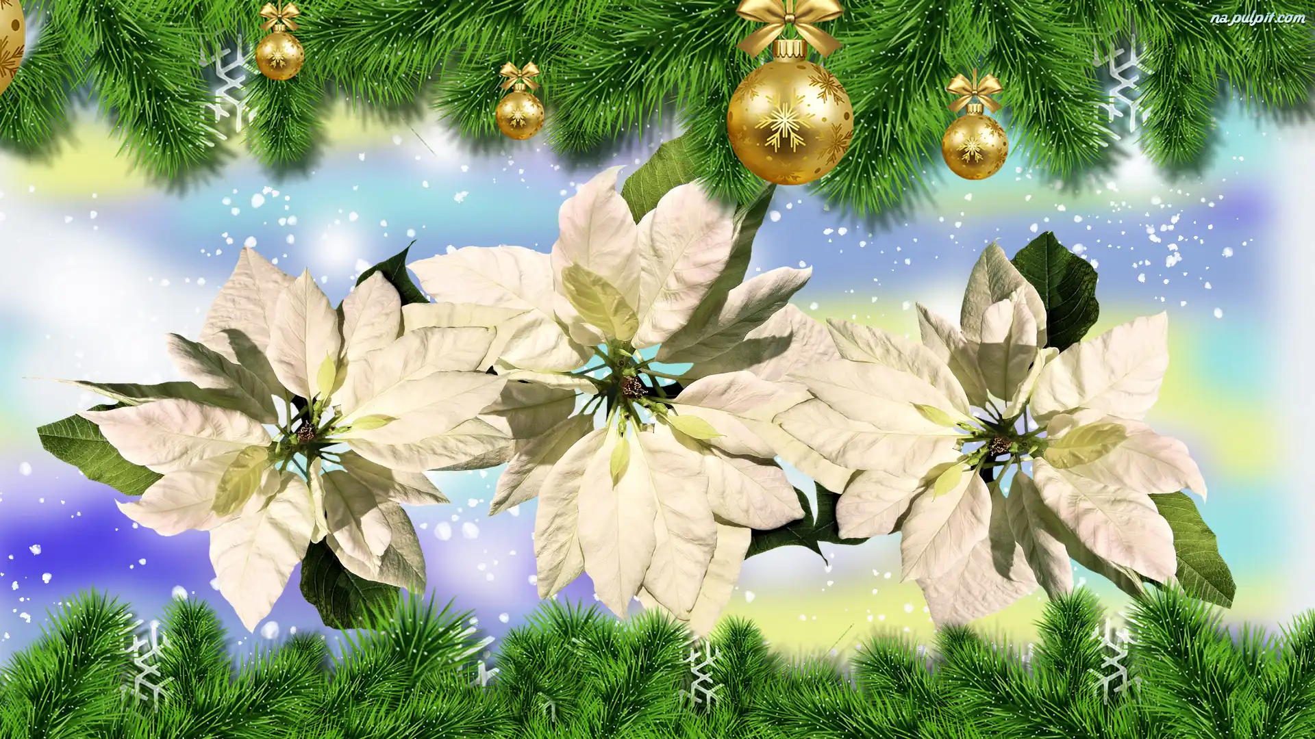 Gwiazdy betlejemskie, Gałązki, Białe, Kwiaty, Bombki, Boże Narodzenie, Poinsecja Na Pulpit