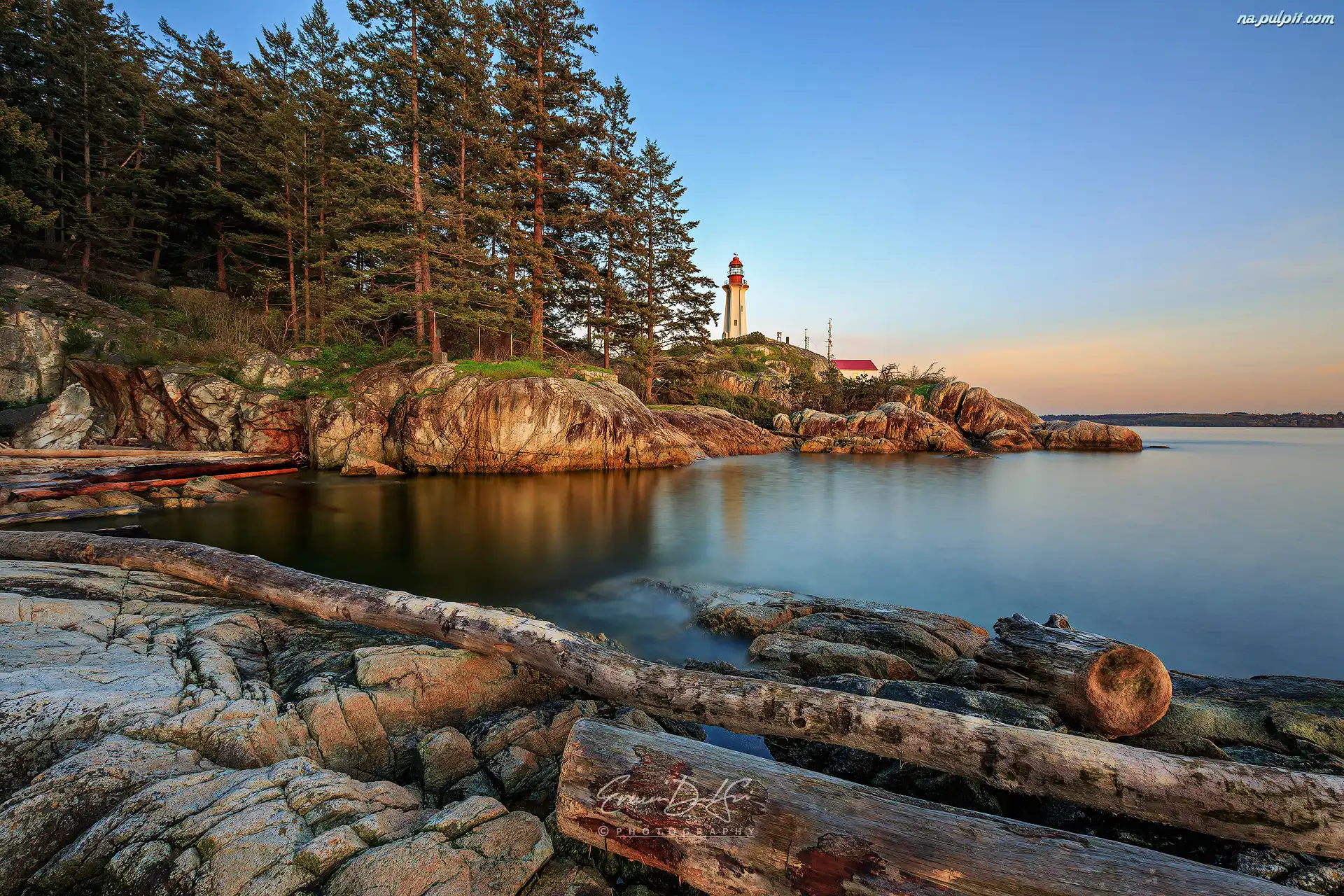 Drzewa, Vancouver, Kanada, Latarnia morska Point Atkinson, Skały, Cieśnina Strait of Georgia Na Pulpit |