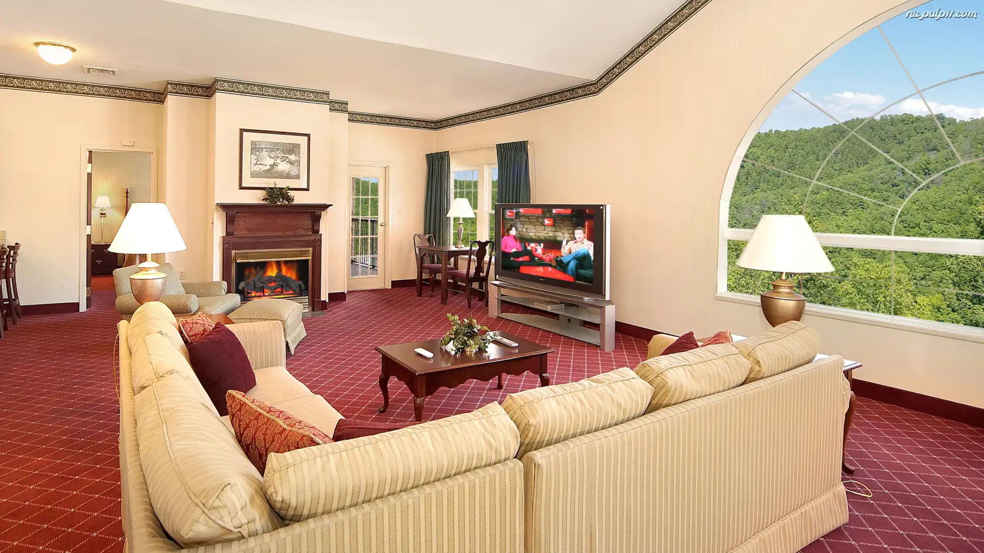 Kominek, Lampy, Okna, Pokój, Narożnik, Stół, Telewizor Na Pulpit