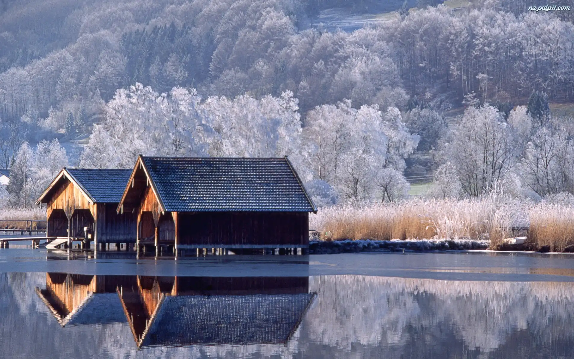 Pokryte, Drewniane, Budynki, Åšniegiem, Drzewa, Dwia