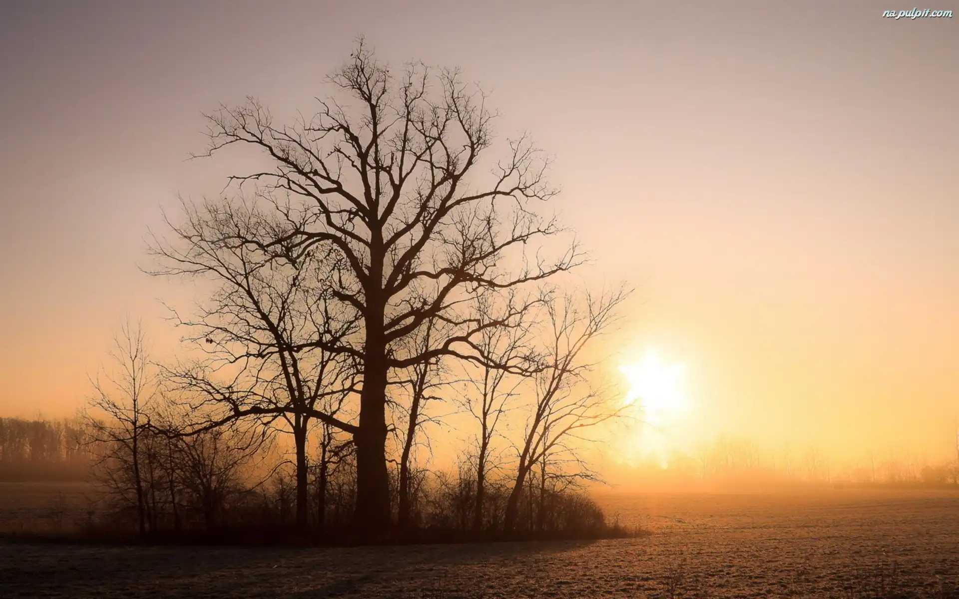 Pola, Słońca, Jesień, Mgła, Drzewa, Wschód