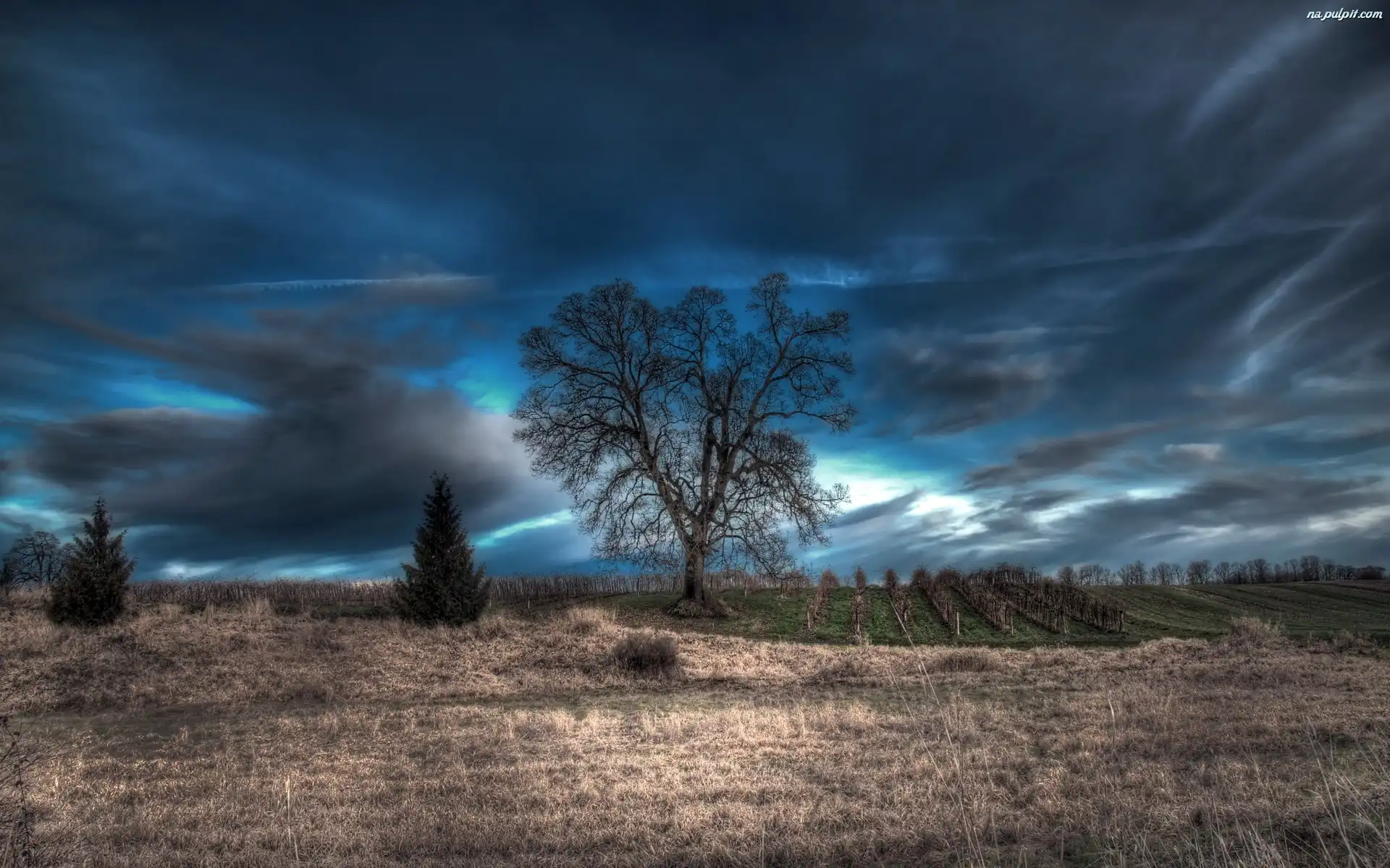 Pola, Chmury, Niebo, Drzewa Na Pulpit