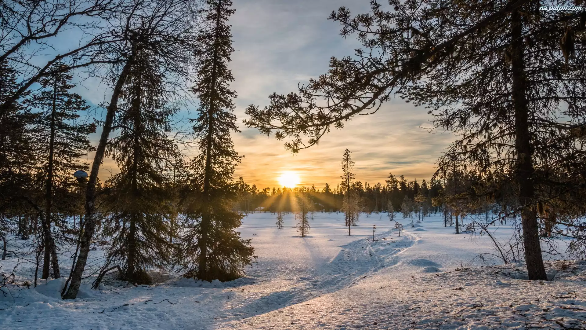 Drzewa, Polana, Śnieg, Wschód słońca, Zima, Las Na Pulpit